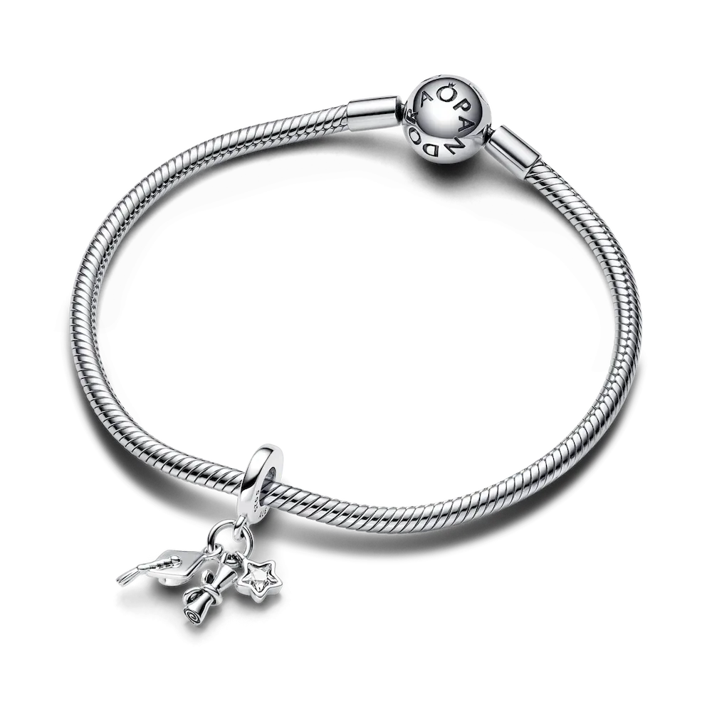 Celebrate your milestone with our 2024 Graduation Triple Dangle Charm, a sterling silver charm capturing the essence of achievement. A star-shaped cubic zirconia gleams alongside a dangling graduation cap with a tasselled flair and a detailed scroll featuring a bow-tied ribbon. The swirling lines depict a rolled diploma, while the ‘2024’ engraving on the bail adds a personalized touch. This charm serves as a sweet reminder of your dedication and success in the journey of education.