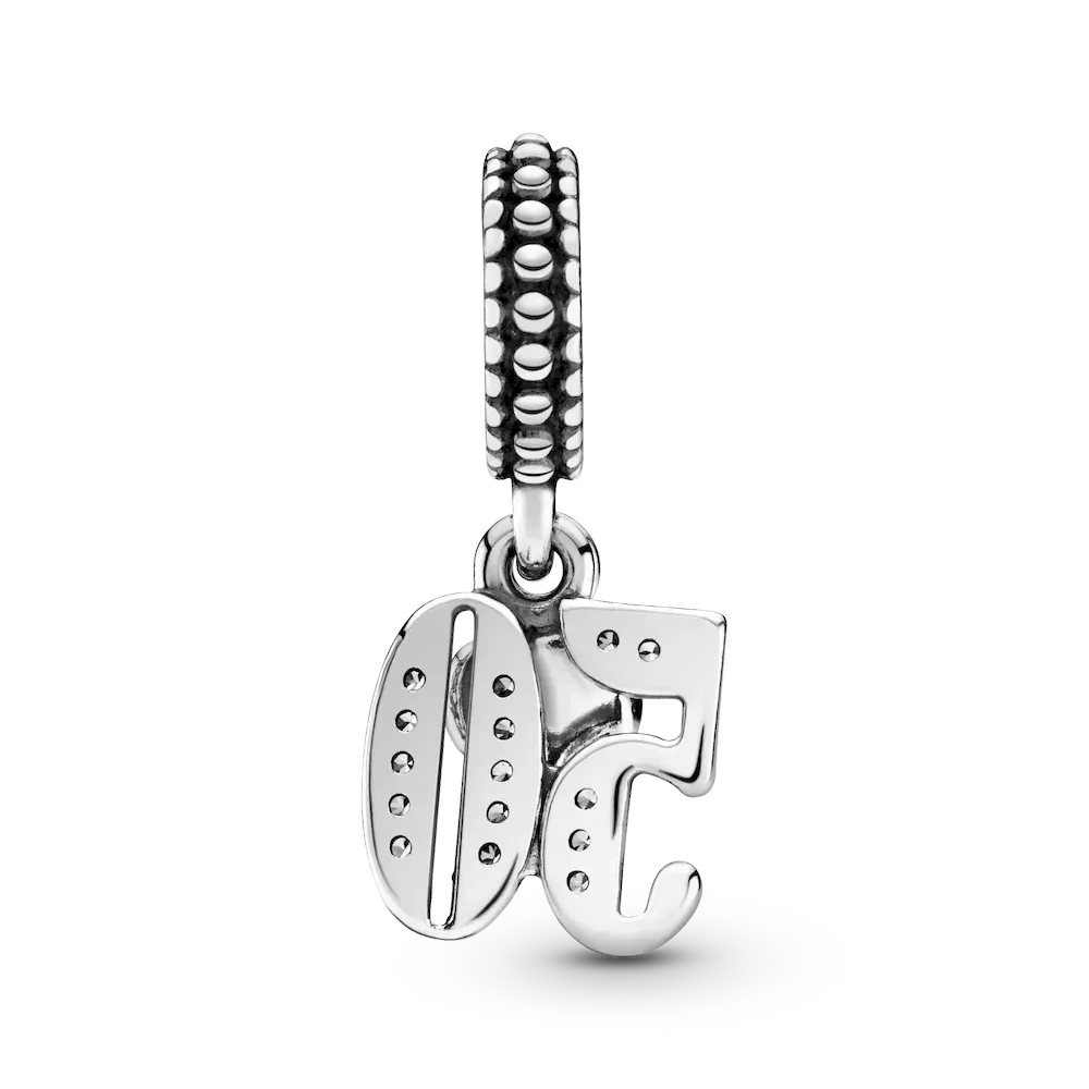 Whether you’re celebrating a 50th anniversary or a half-century birthday, this nifty fifty charm is the one to do it with. The sterling silver dangle is accented with cubic zirconia and detailed on the bail with beading. A miniature rosebud pendant completes the celebratory style. Wear or share the Pandora Moments piece as part of your unique story.