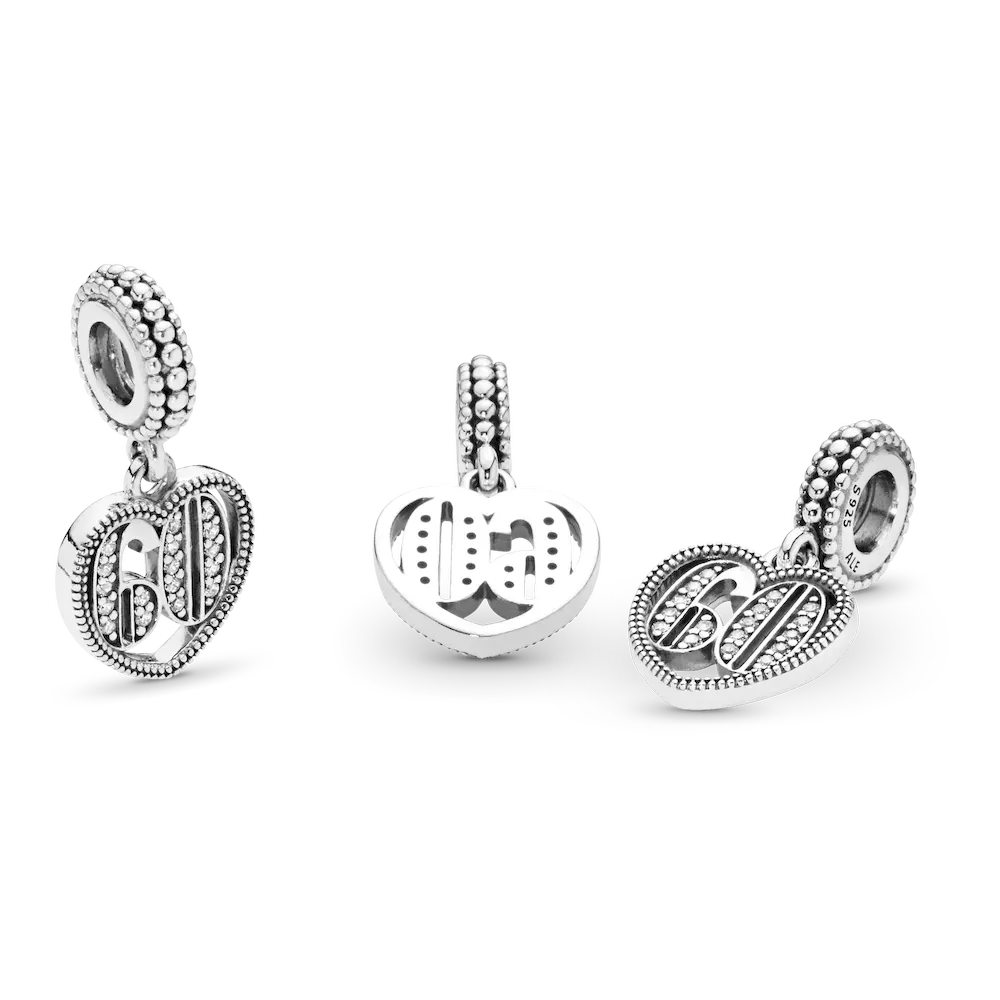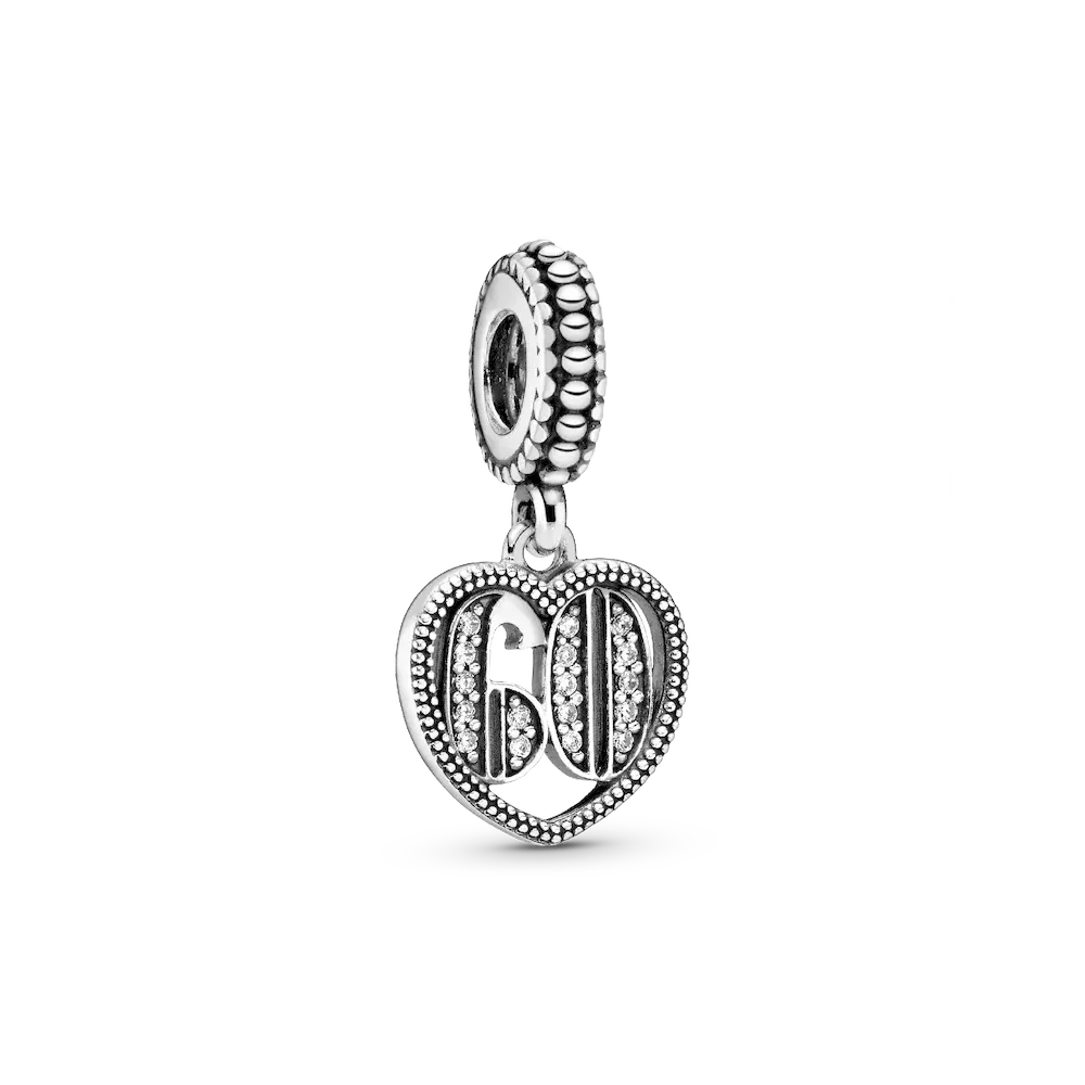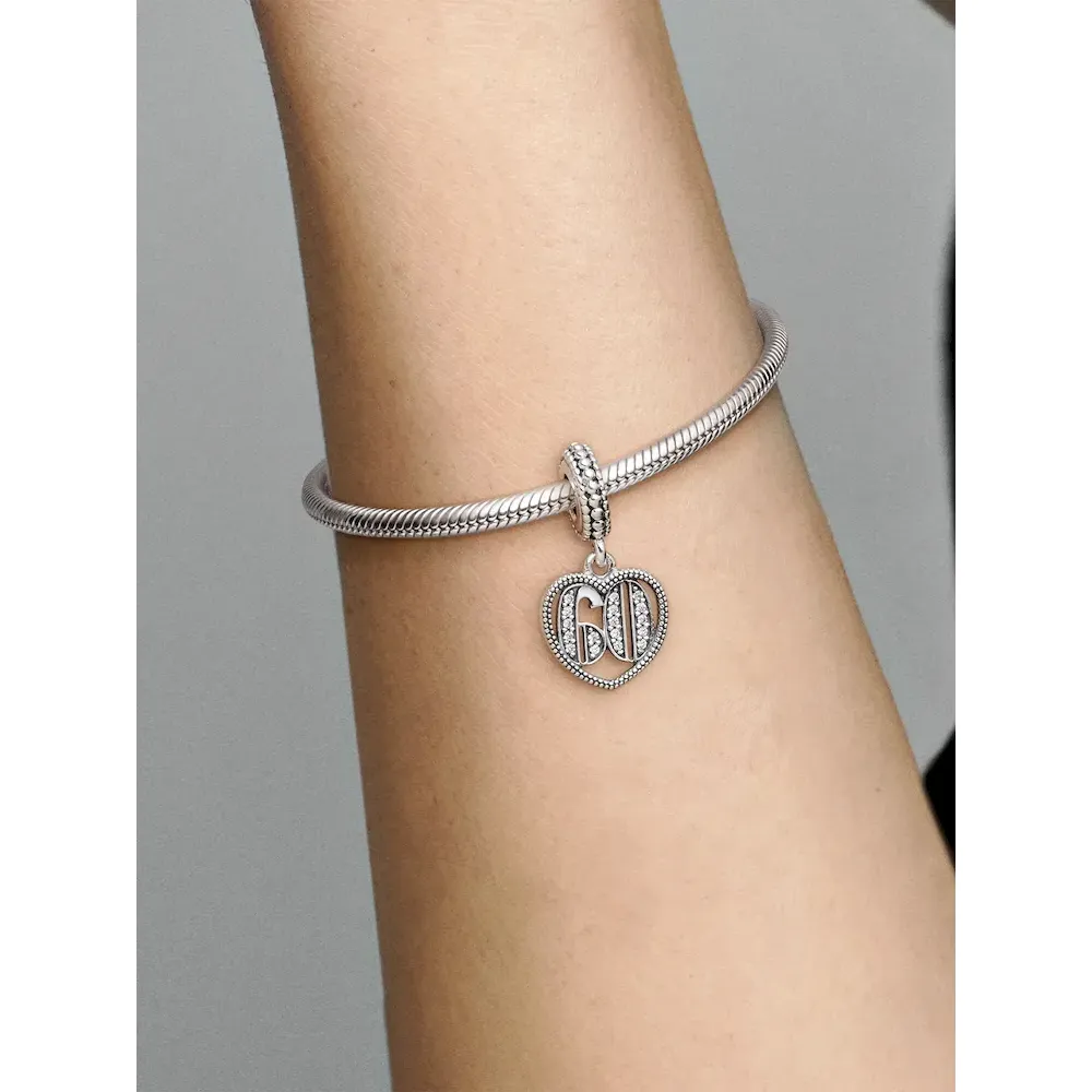 Detailed with the number 60, our celebratory dangle charm in sterling silver is set with glittering cubic zirconia for subtle sparkle. The heart-shaped style is ideal for commemorating a 60th birthday or anniversary – or whatever the number means to you. Thread it on a Pandora Moments bracelet or wear it as a pendant on a necklace chain.