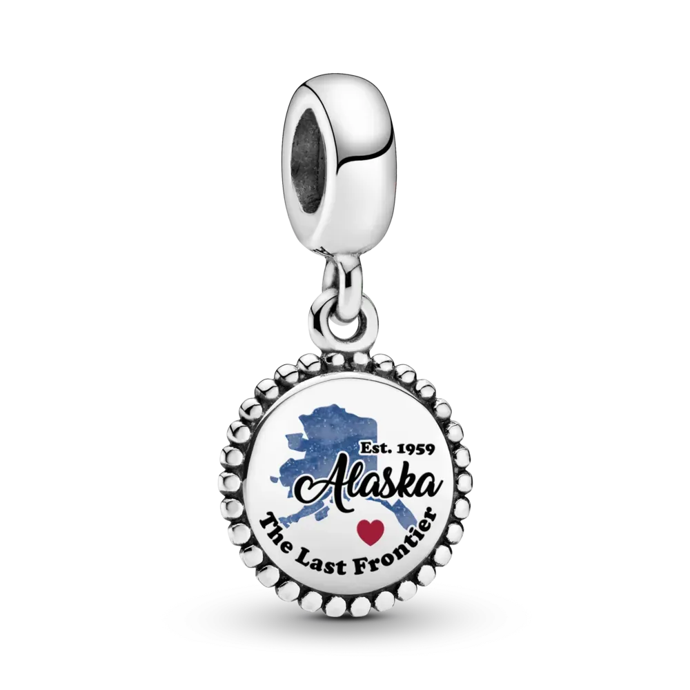 For all who call Alaska their home, love to visit or dream of exploring the last frontier—this classic sterling silver dangle charm captures the state’s shape in glossy blue enamel with “Alaska” beautifully scripted in black, and a small red heart underneath. A charming token of the place you’ll always hold dear, no matter how far you are.