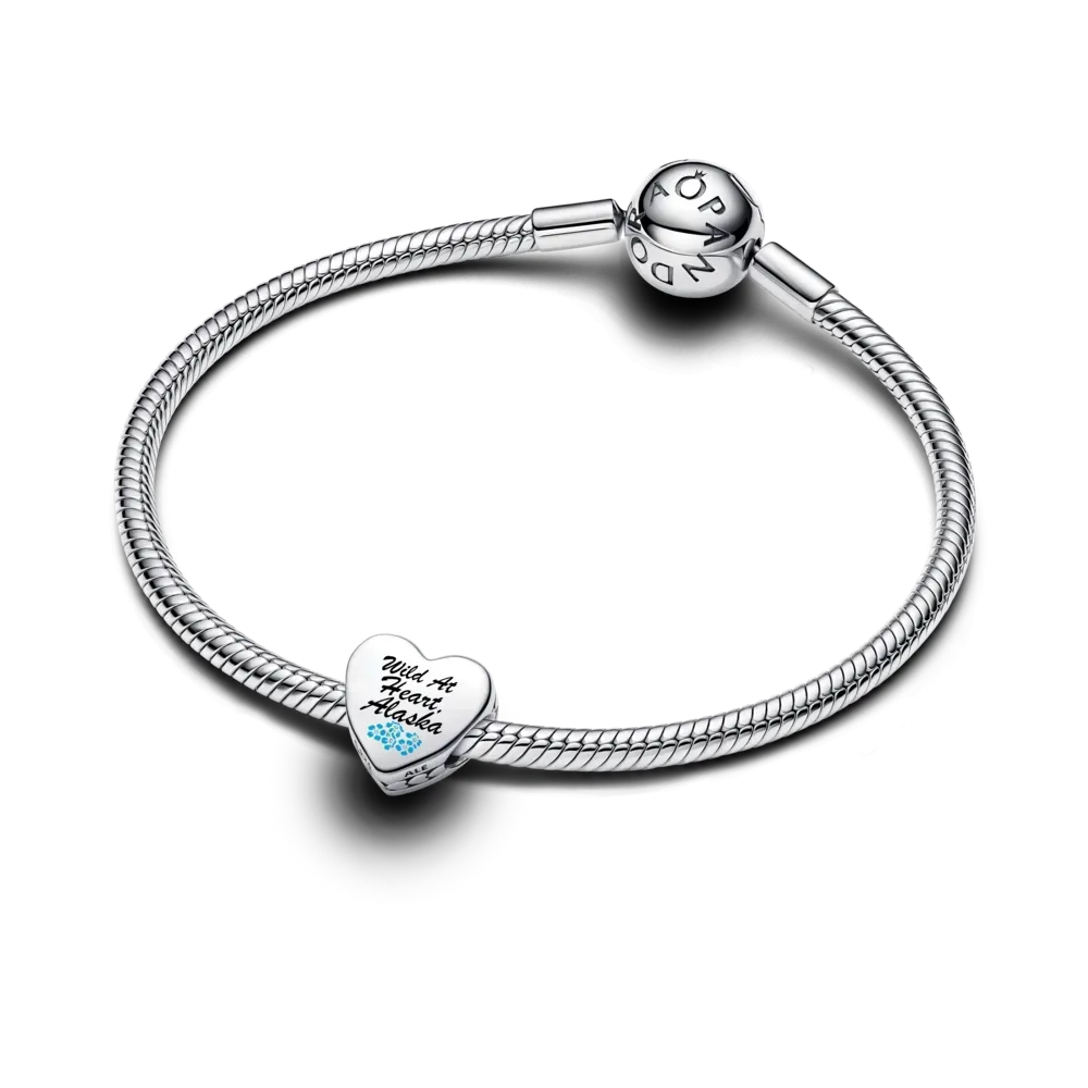 Dive into the beauty of Alaska’s wilderness, artfully depicted in colorful enamel on one side of this sterling silver heart-shaped charm. On the other side features “Wild At Heart, Alaska” scripted in black with delicate forget-me-nots underneath. A piece as beautiful as the land itself, carried with you always on a favorite Pandora bracelet or necklace.