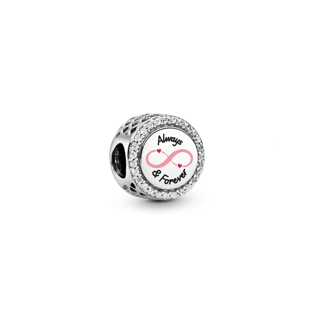 The Engravable Always & Forever Charm is a stunning representation of eternal love. This circle-shaped charm is encircled by a dazzling row of cubic zirconia, catching the light and adding a touch of sparkle. At the heart of the charm is a delicate pink circle, beautifully inscribed with “Always & Forever” in elegant lettering, while a timeless infinity symbol sits at its center, representing endless connection. The back of the charm offers space for personal engraving, making it a perfect keepsake to commemorate a special bond, anniversary, or milestone. Whether given as a gift or worn as a daily reminder, this charm captures the beauty of love that lasts forever.