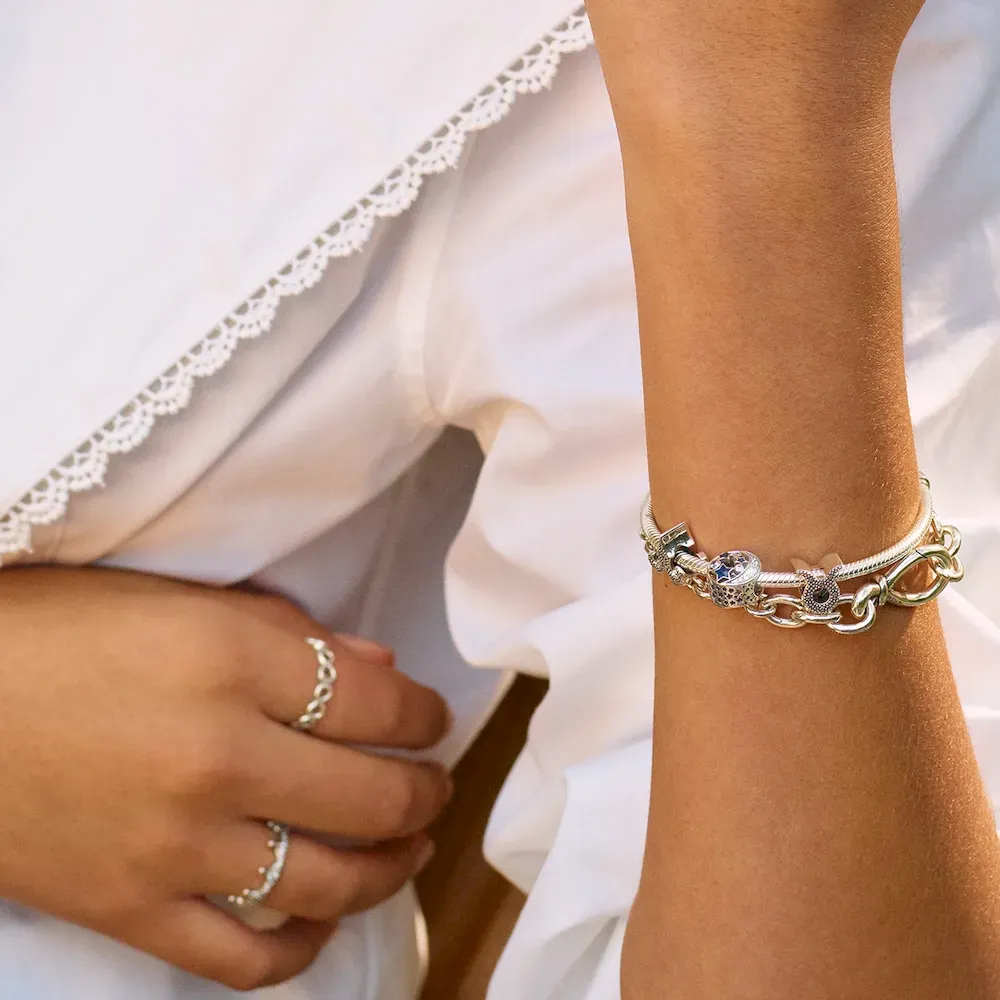 Show off your Aries pride with the Aries Zodiac Charm Studded Bracelet Set. This sterling silver bracelet features a studded chain and a celestial Aries charm with sparkling cubic zirconia and star detailing.