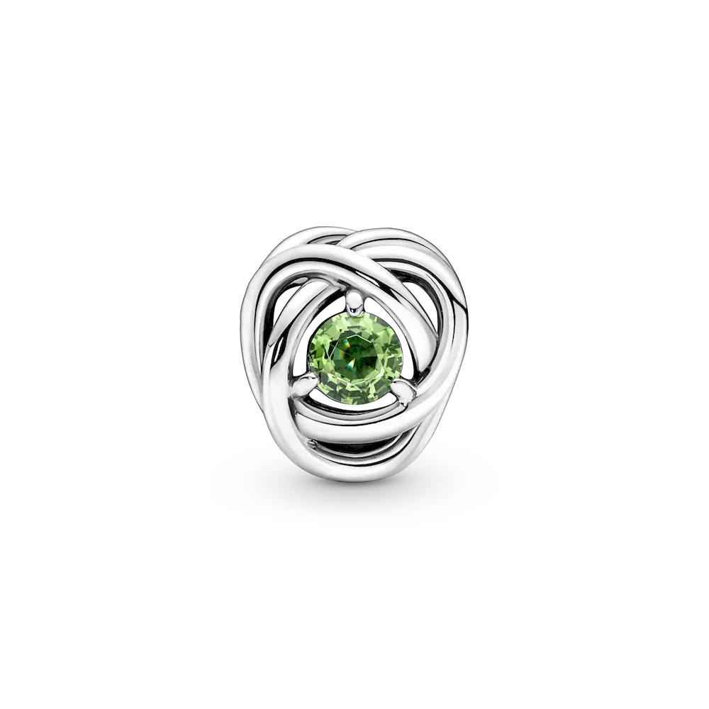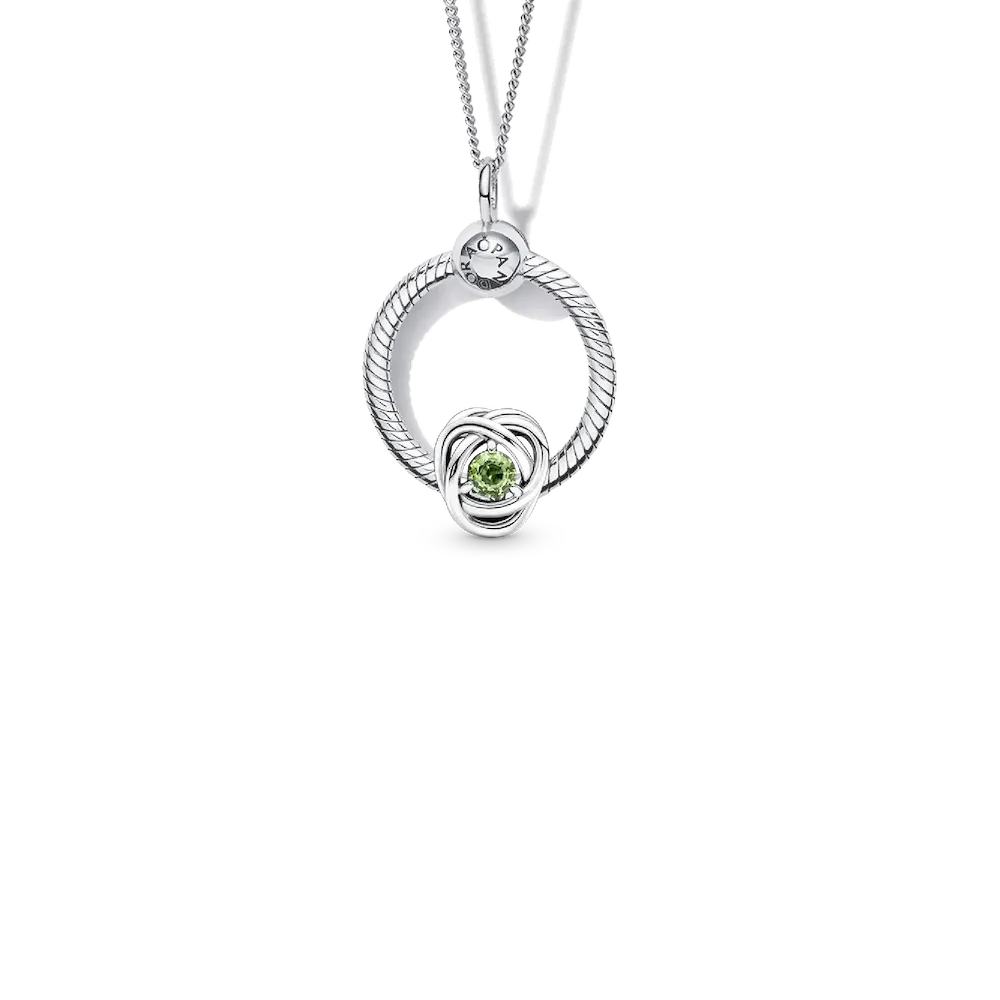 The bright green hues of the August Birthday Necklace Set represent nature and harmony, making it an inspiring gift for anyone celebrating a birthday this month. The set includes the Spring Green Eternity Circle Charm in sterling silver and spring green man-made crystals, a snake-chain patterned Pandora Moments Small O Pendant and a Classic Cable Chain Necklace in sterling silver.