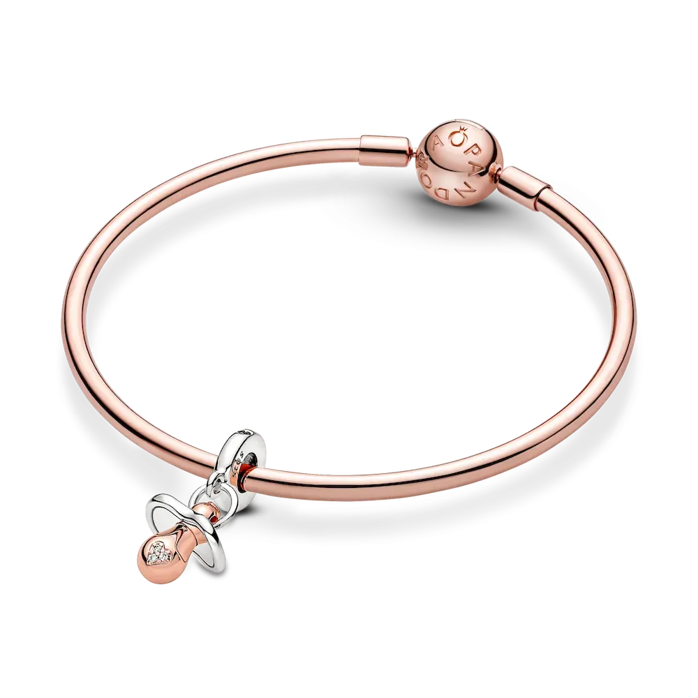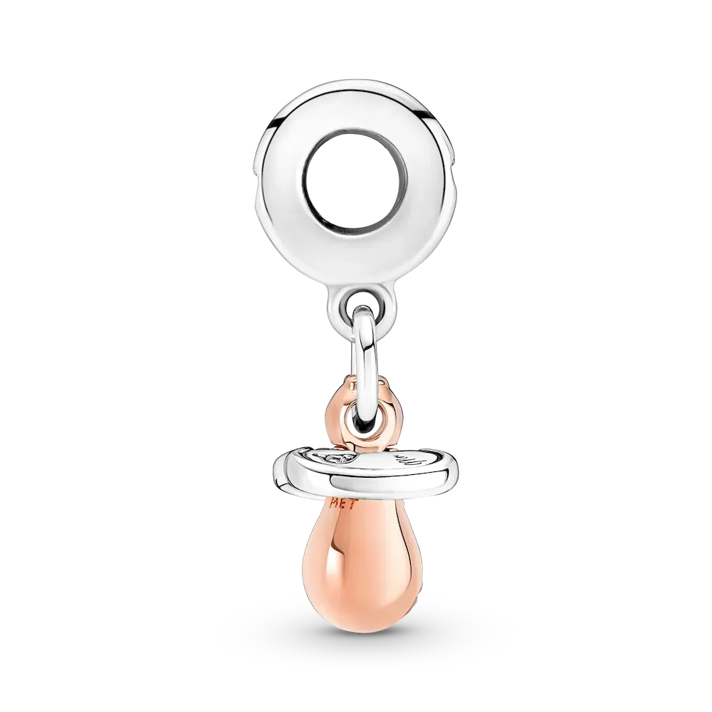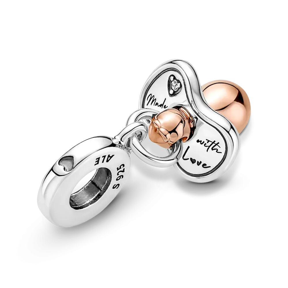 Celebrate a new arrival in the family with the Baby Pacifier Dangle Charm. The 14k rose gold-plated mouthpiece sparkles with a cubic zirconia pavé set in the shape of a heart. The sterling silver pacifier shield is accented with a single stone and is engraved with the words: