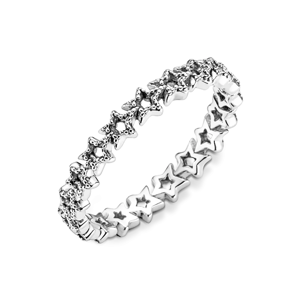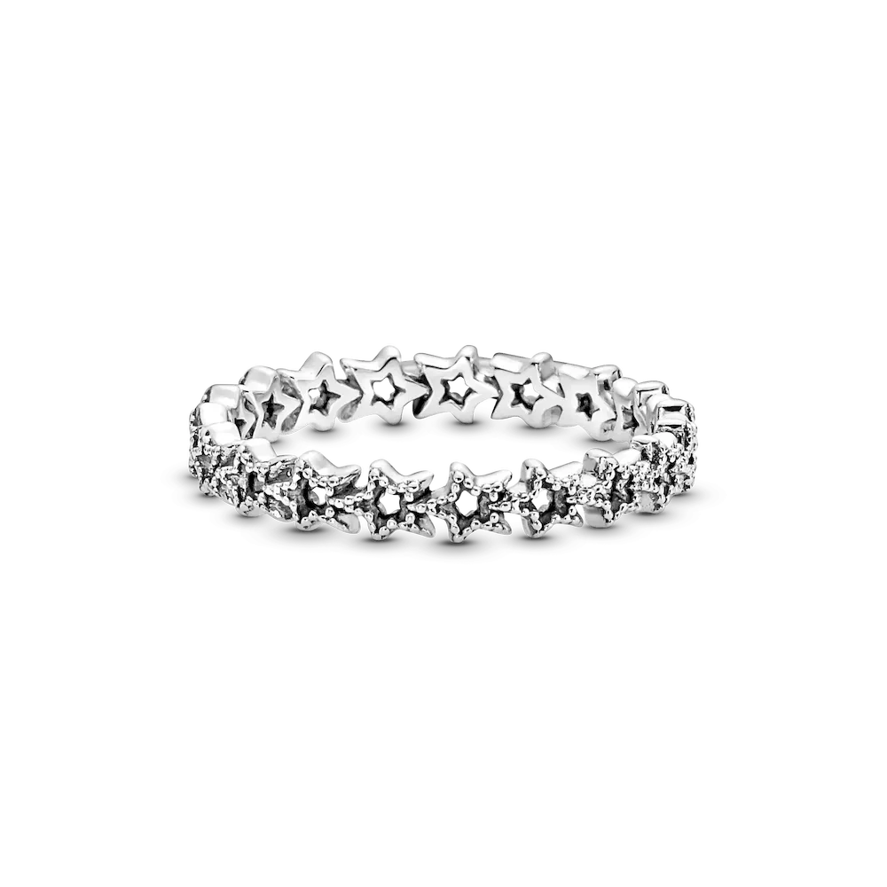 Bring starry sparkle to your outfits with the Band of Asymmetric Stars Ring. Inspired by celestial beauty, the sterling silver ring features a band of asymmetric openwork stars with delicate milgrain details. The show-stopping design looks equally beautiful worn on its own or layered with other Pandora rings. A classic and sophisticated addition to any woman’s wardrobe. Alternatively, surprise someone special with this piece as a token of your love.