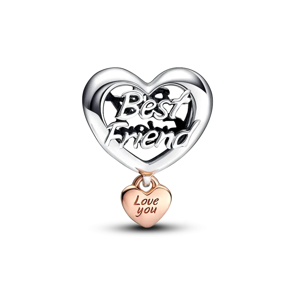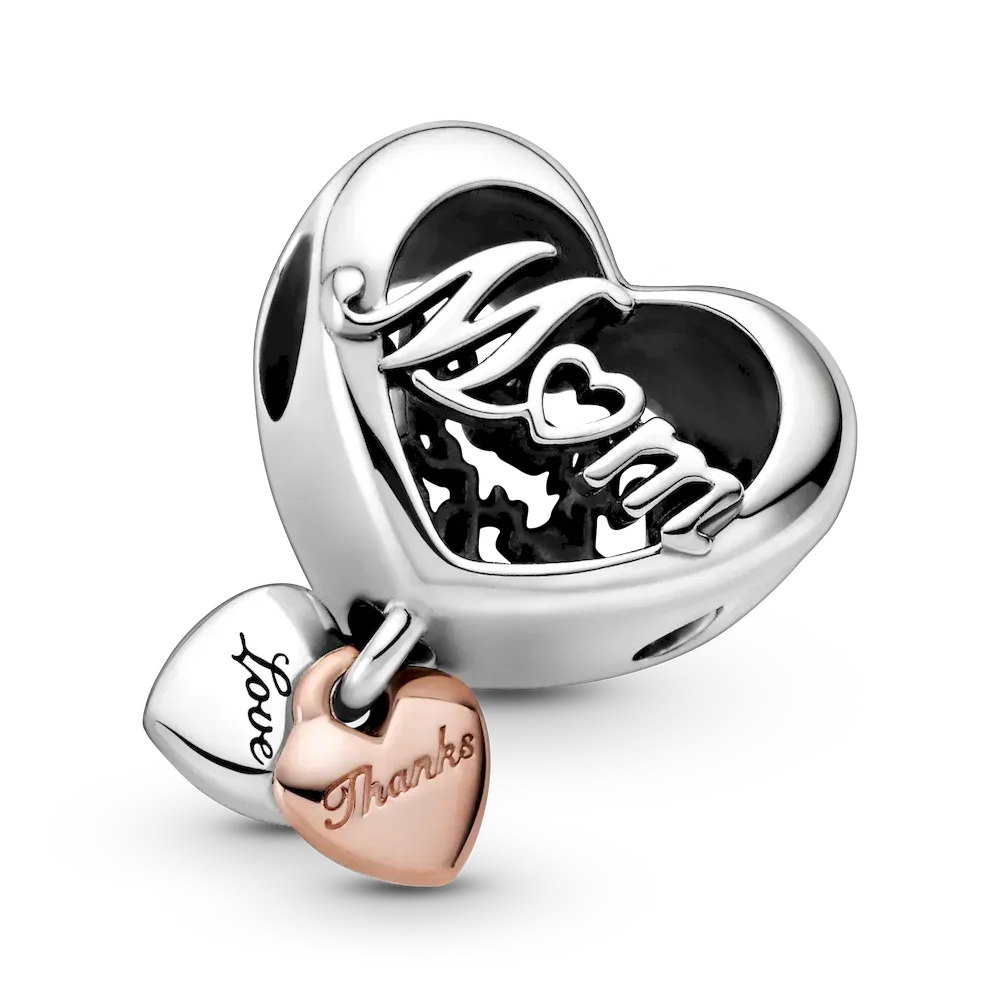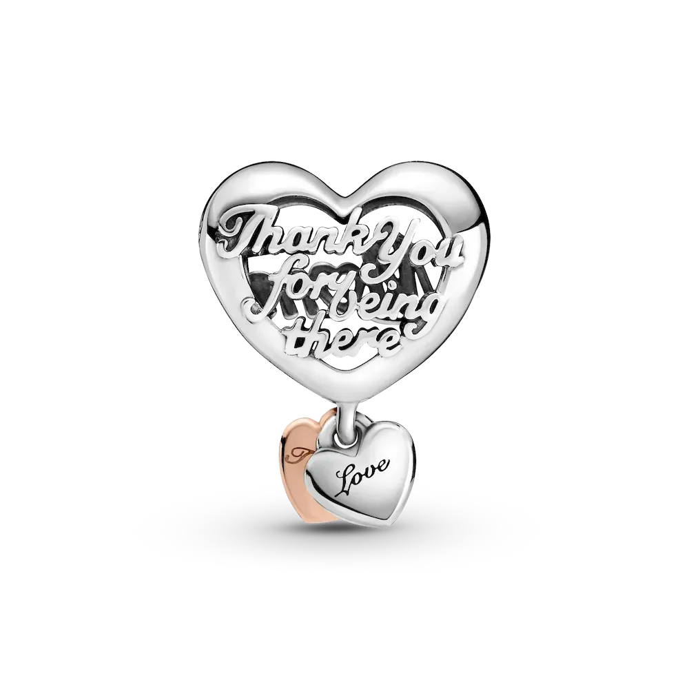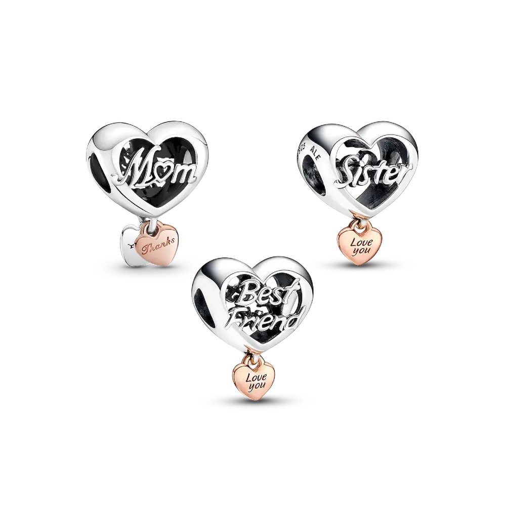 Treat your bestie, your sister or your mom to a beautiful representation of the bond you share. The Love You Sister Heart Charm and Love You Best Friend Heart Charm are both two-toned in sterling silver and 14k rose gold-plating with a smaller heart dangling from the bottom with the engraving “Love You.” The Thank You Mom Heart Charm features openwork design with “Mom” on the front and “Thank you for being there” on the back, and double hearts attached to the bottom with “Love” and “Thanks” engraved.