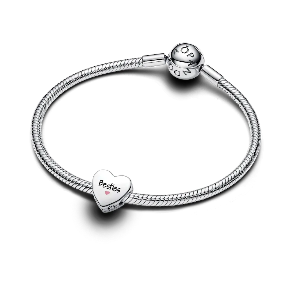 The Engravable Besties Heart Charm is the perfect tribute to your one-of-a-kind friendship. Crafted in smooth sterling silver, this heart-shaped charm features “Besties” inscribed in bold black lettering, with a darling pink heart sitting just below for a pop of colour. Its polished finish gives it a sleek, modern look, while the back offers space for your own personal engraving, making it even more meaningful. Whether you’re gifting it to your best friend or wearing it as a reminder of your close bond, this charm captures the essence of friendship with style and heart.