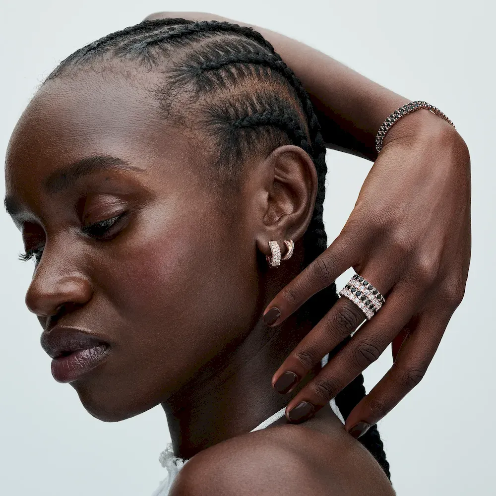Add boldness to your look with the Black Sparkling Tennis Bracelet. Plated with 14k rose gold, it showcases 48 prong-set black man-made crystals in squared open baskets. The adjustable closure with a dangling stone offers a personalized fit. Ideal for stacking with various colors and metals, this bracelet introduces a bold black stone to Pandora’s Timeless collection. Experience the elegance of repetition and contrast, adding depth to your bracelet stack.