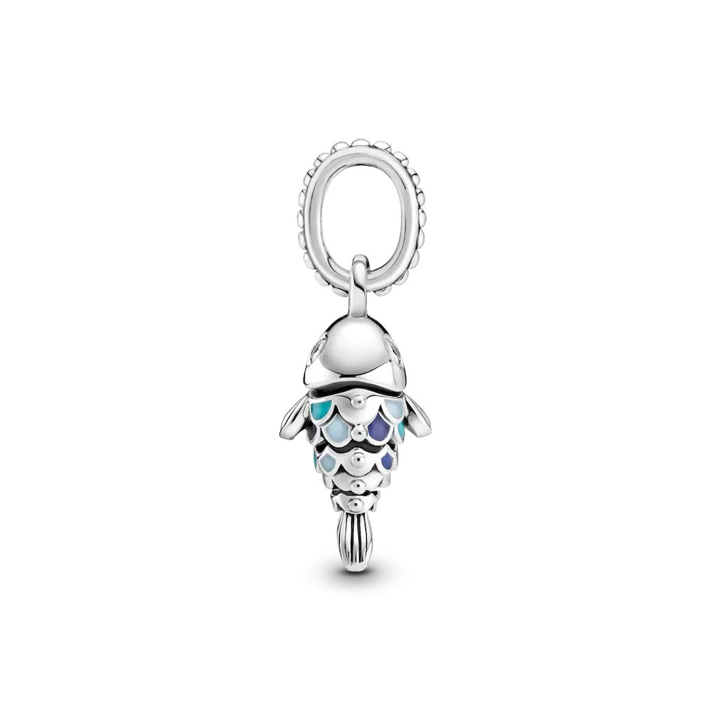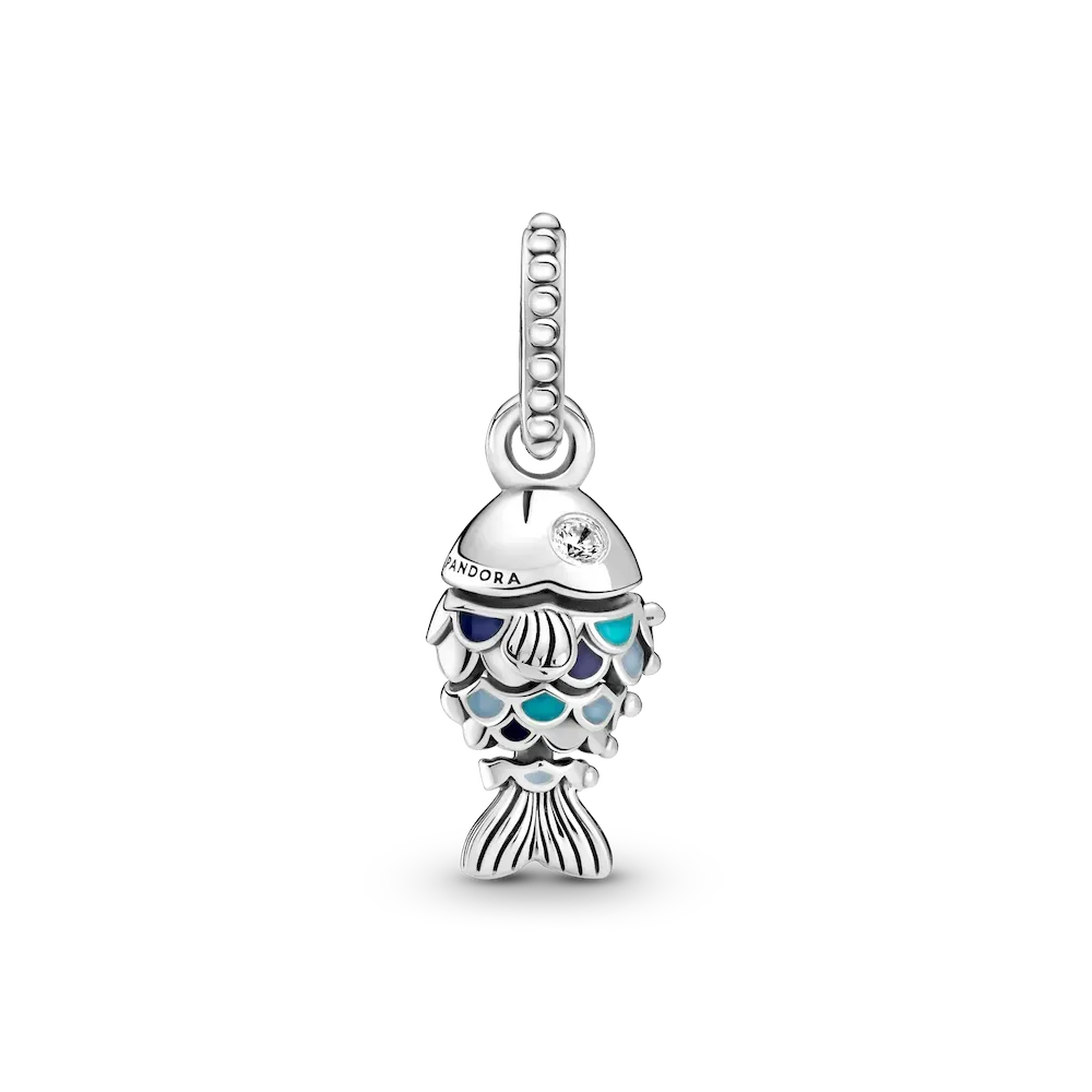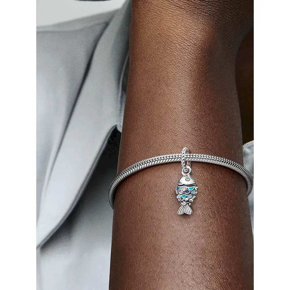 Add an enchanting underwater friend to your collection with the Blue Scaled Fish Dangle Charm. This sterling silver fish charm captures the essence of the sea with shimmering clear cubic zirconia eyes, hand-applied blue enamel scales in three tones, grooved lines on the tail and fins and delicate beading along the spine. A reminder to go with the flow, the fish appears to be swimming as you move thanks to a flexible design and subtle moving parts.