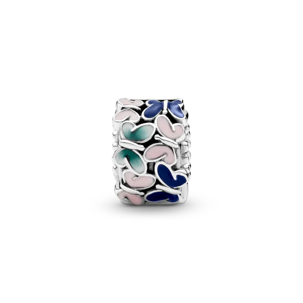 Add a dose of color to your look with this clip charm hand-finished in sterling silver. Detailed with a swarm of butterflies, the meaningful charm features vibrant hand-applied enamel. It’s the perfect piece to create a garden-inspired look on your favorite bracelet. Wear the clip charm to help you evenly space your chosen charms with style. This clip charm features no silicone grip, so it will slide if not styled onto threads (two raised charm dividers).