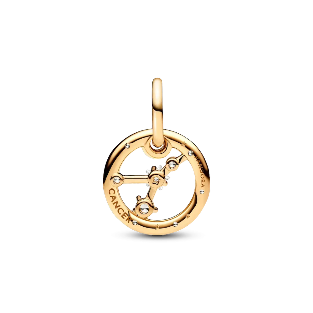 Let the stars guide your look with the Pandora Cancer Zodiac Dangle Charm. The dangle is crafted our 14k gold-plated unique metal blend, has a circular outer frame and features clear sparkling cubic zirconia as well as the shape of the Cancer zodiac sign. The back side of the frame is engraved with