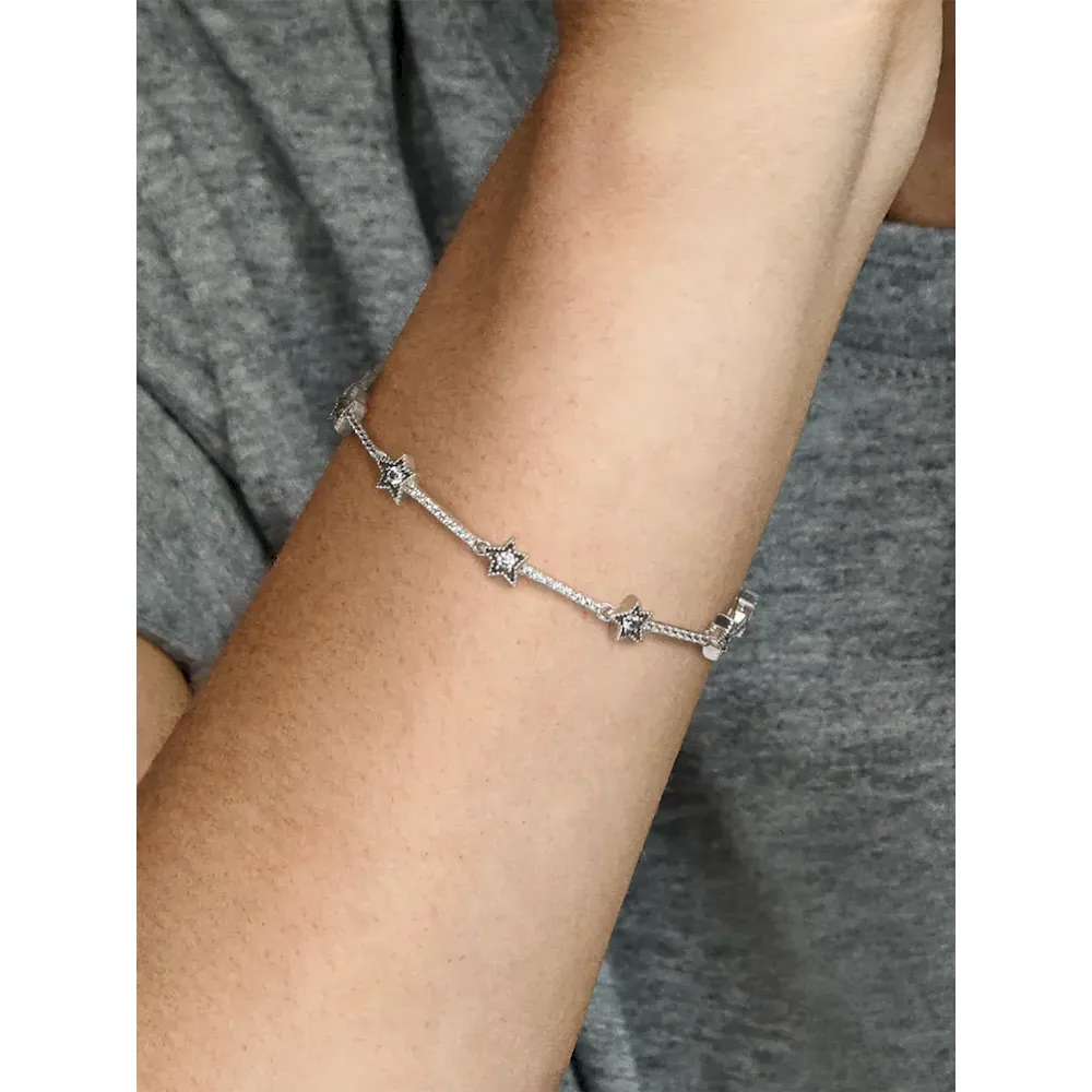 Let yourself be inspired by our magical, dreamy world based on the mystery of the night sky and the brilliance of starlight. Our star bracelet features a collection of irregularly-shaped sterling silver star shapes embellished with round cubic zirconia stones bound together by pavé bars to evoke a life beyond your wildest dreams, with each star symbolizing a past milestone or a future achievement. Let the sterling silver bracelet remind you of all of the proud moments that make you, you.