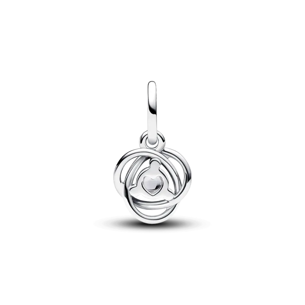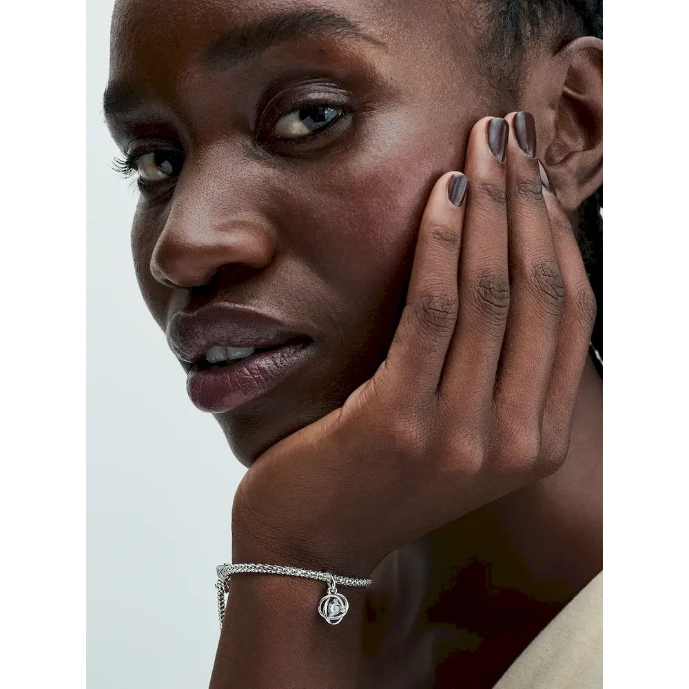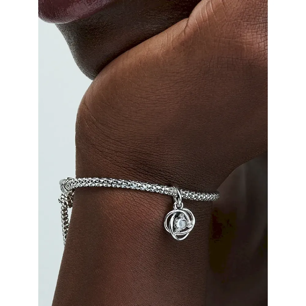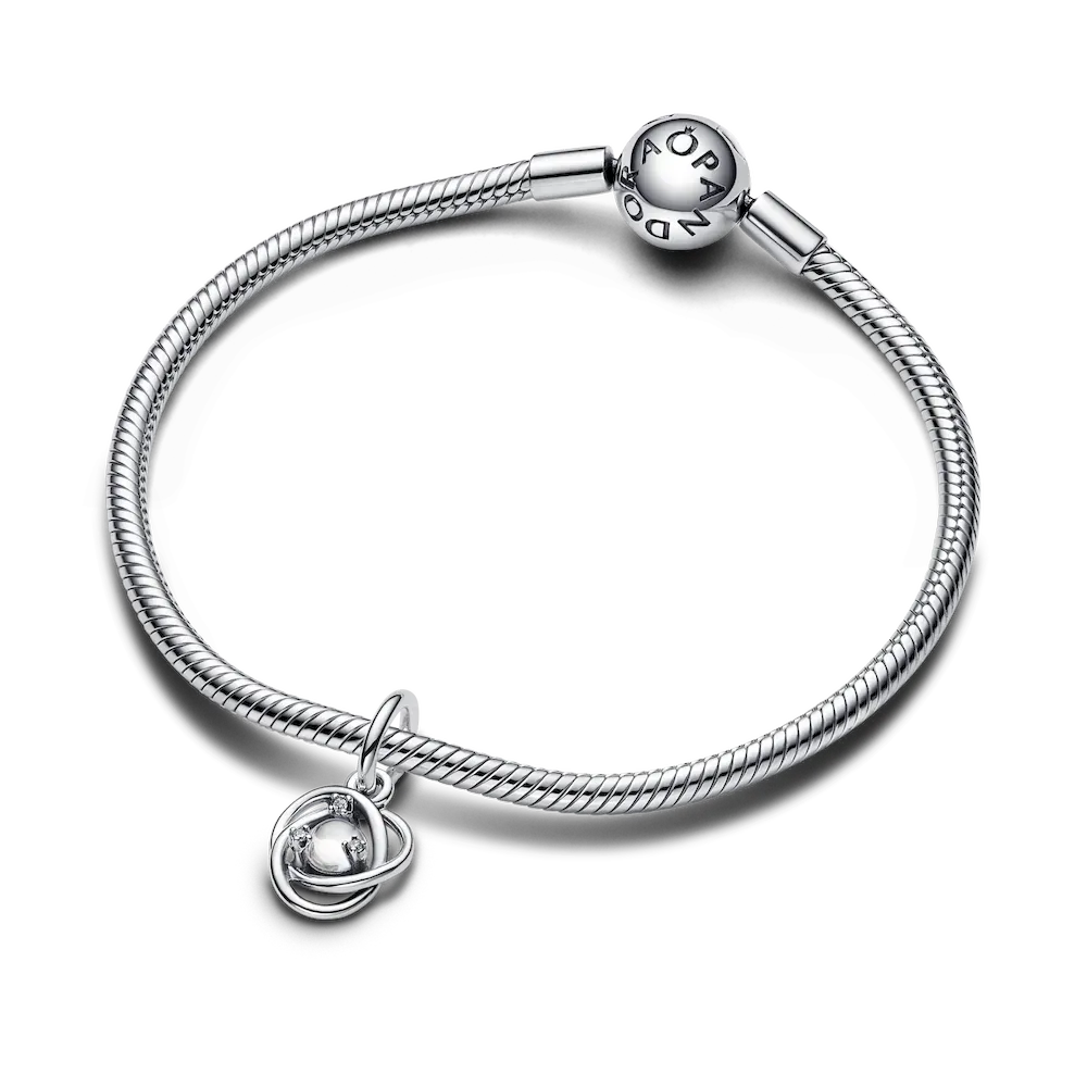 This intricate Clear Eternity Circle Dangle Charm is a must-have for your Pandora Moments collection. Crafted in lustrous sterling silver, it features an openwork infinity braid decorated with a central larger clear cubic zirconia, elegantly surrounded by three smaller clear cubic zirconia. The intricate design symbolizes eternity and adds an additional layer of meaning to the piece. Elevate your bracelet with this timeless piece or gift it as a representation of an everlasting bond.
