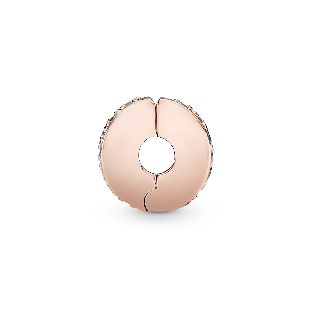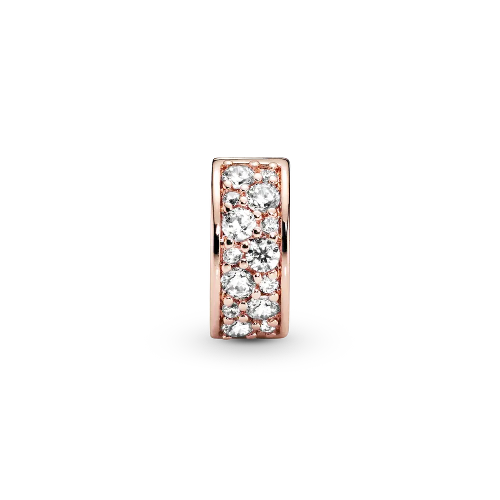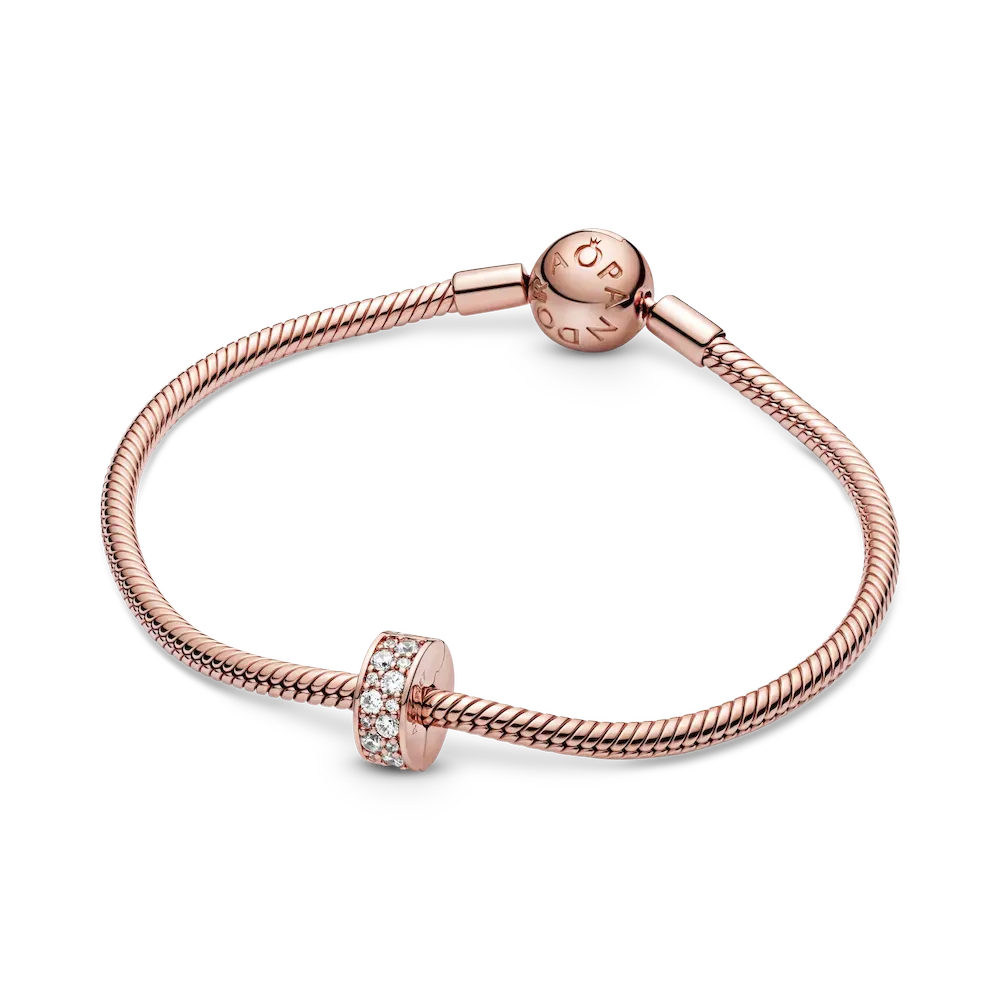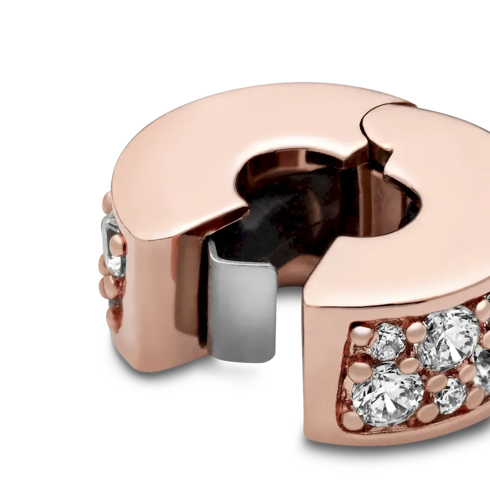 You don’t have to shout to make a strong statement. Our 14k rose gold-plated Clear PavĂ© Clip Charm adds a powerful touch to your bracelet, bringing both balance and beauty. It’s pavĂ©-set with cubic zirconia that lend sparkle to your look. Clip multiples onto your bracelet to create a symmetrical styling, or add a single piece for a minimalist look. Your mood sets the tone. This clip charm features a silicone grip, does not fit onto threads (two raised charm dividers.) This charm can be styled anywhere else on the bracelet.