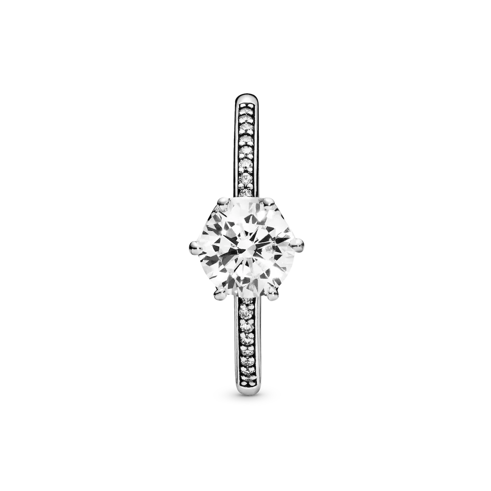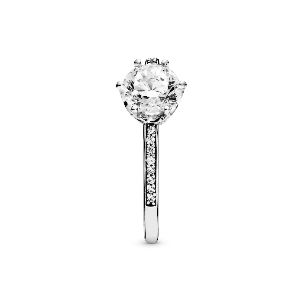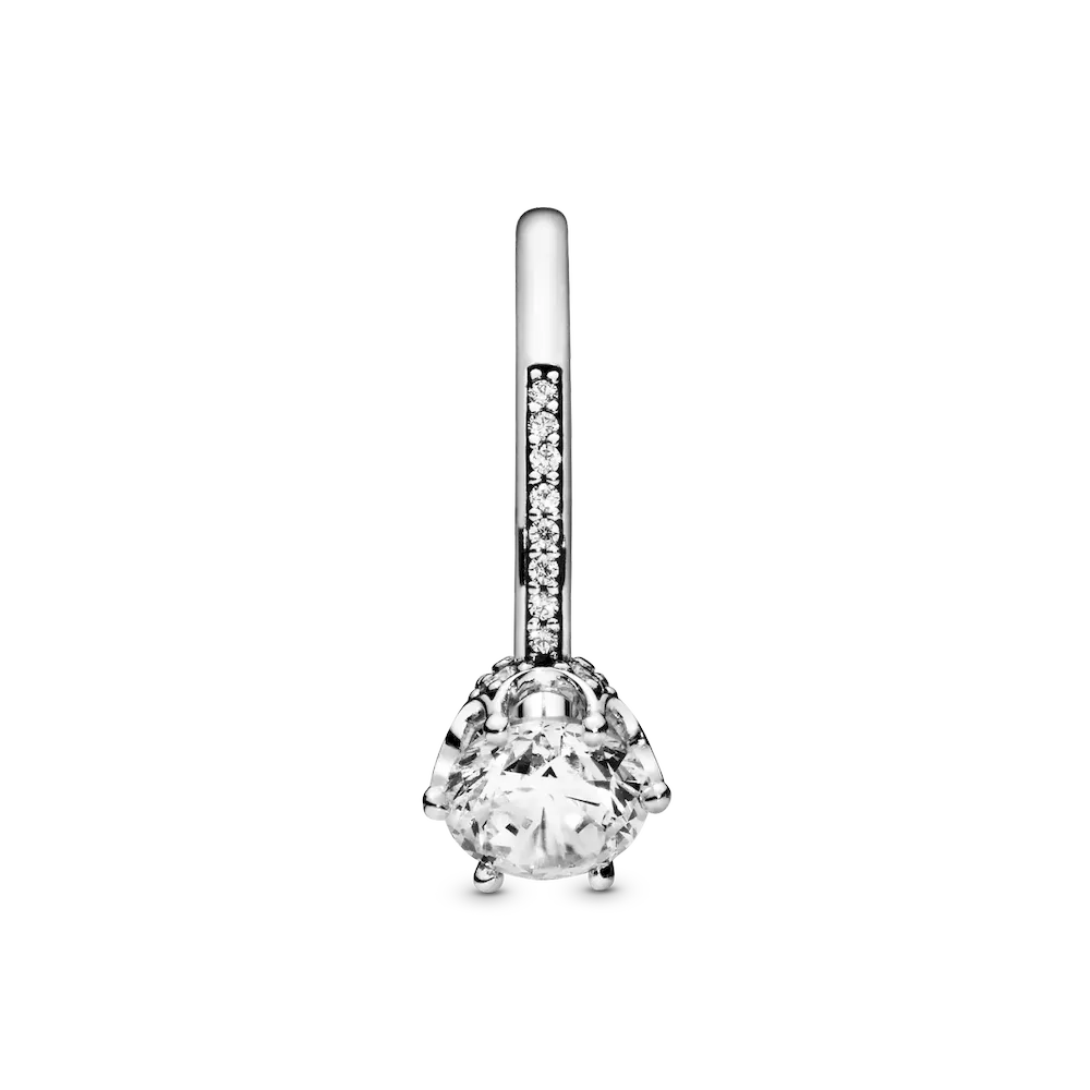 Bring an explosion of sparkle to your outfits with the sterling silver Clear Sparkling Crown Ring. The claw setting of the large clear cubic zirconia creates the effect of a regal crown on the solitaire ring and is complemented by additional small stones set along the ring band. A ring that’s fit for the special princess or queen in your life, it can be paired with most other selections from the Pandora collection for a truly regal look.