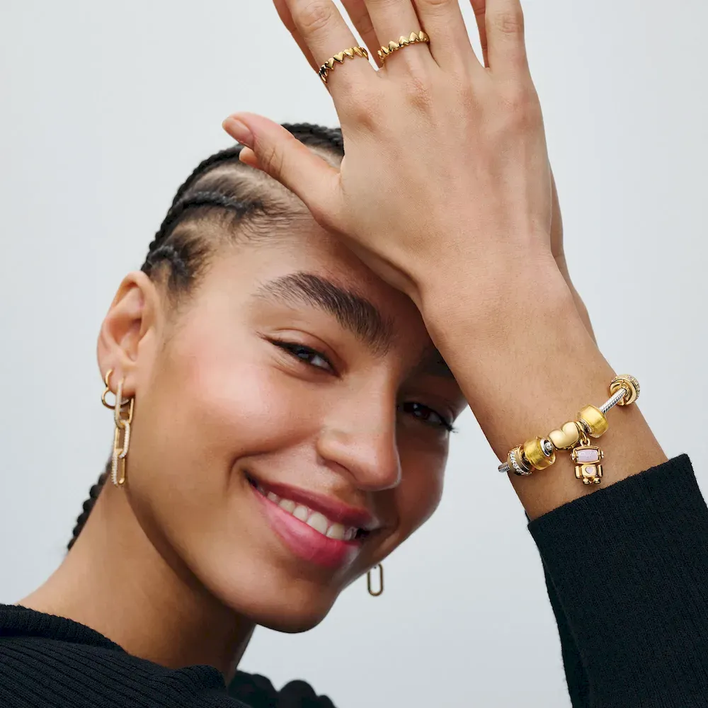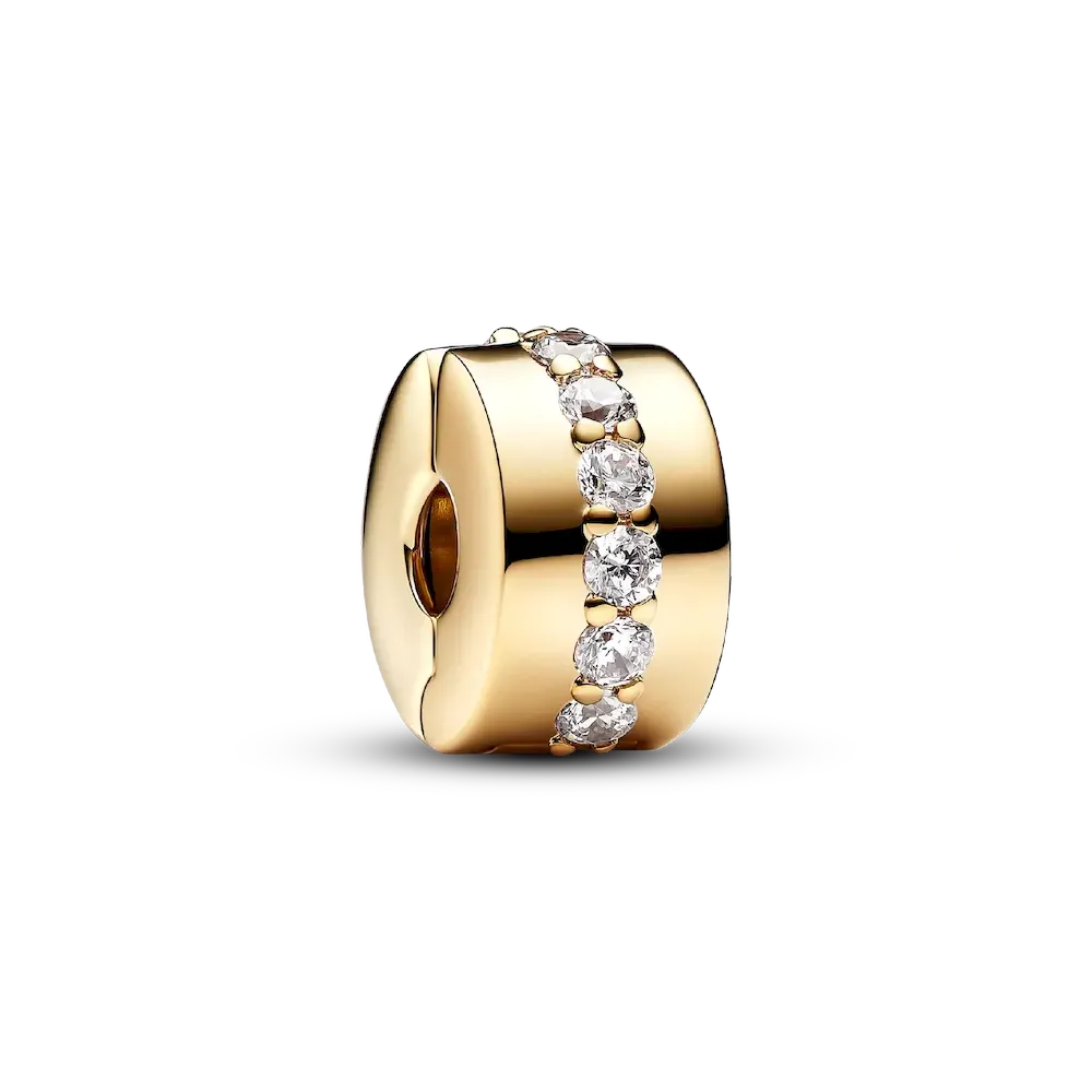 Bring balance to your Pandora charm bracelet with this sparkling clip charm. This sleek 14k gold-plated piece is accented with a row of shimmering clear cubic zirconia stones. This clip charm features no silicone grip, so it will slide if not styled onto threads (two raised charm dividers).
