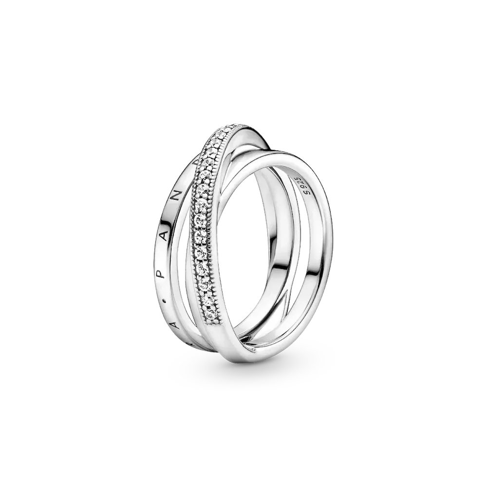 Go for linear layers with the Crossover Pavé Triple Band Ring. This Sterling Silver ring features three bands, with one diagonally overlapping the other two. One inner band has the Pandora logo, the other inner band is polished and the outer band features clear cubic zirconia pavé framed by micro-beading. All three bands merge at the back of the ring shank. Inspired by the spiral structure of the solar system, this ring brings a sleek, structural sophistication to any look.