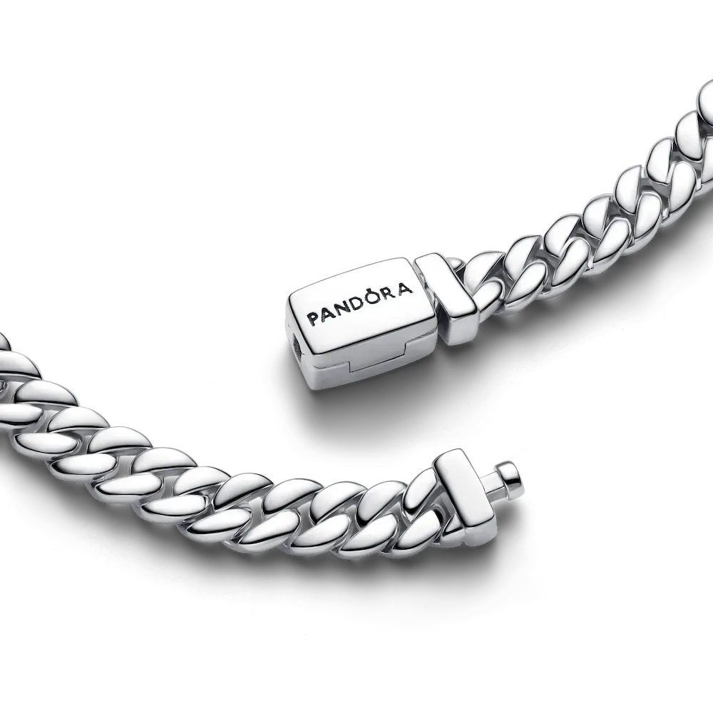 Elevate your look with this Cuban chain bracelet. Crafted in sterling silver, both sides are polished for a high-shine finish. It closes with a flat clasp, embossed with the PANDORA logo.