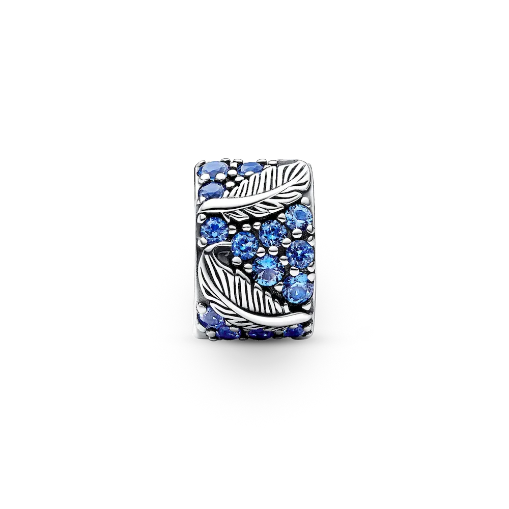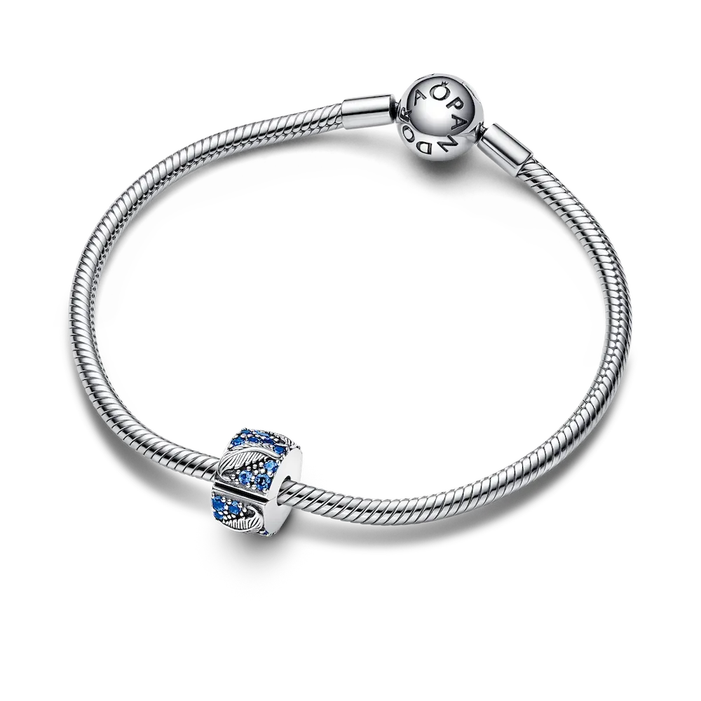 Take flight with our Curved Feather & Pavé Clip Charm. Hand-finished in sterling silver, this charm features blue man-made crystals and floating feathers detailed with realistic texturing. Inspired by the idea that each feather has the power to give you wings, gift it to the one who always lifts you up. Please note: this clip charm is not lined with silicone, so it will slide unless styled over threads (two raised charm dividers).