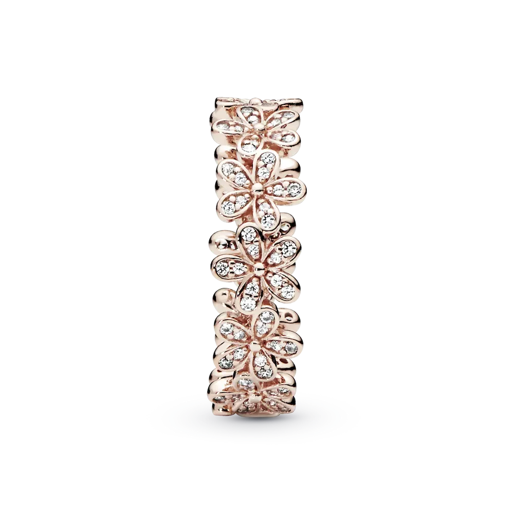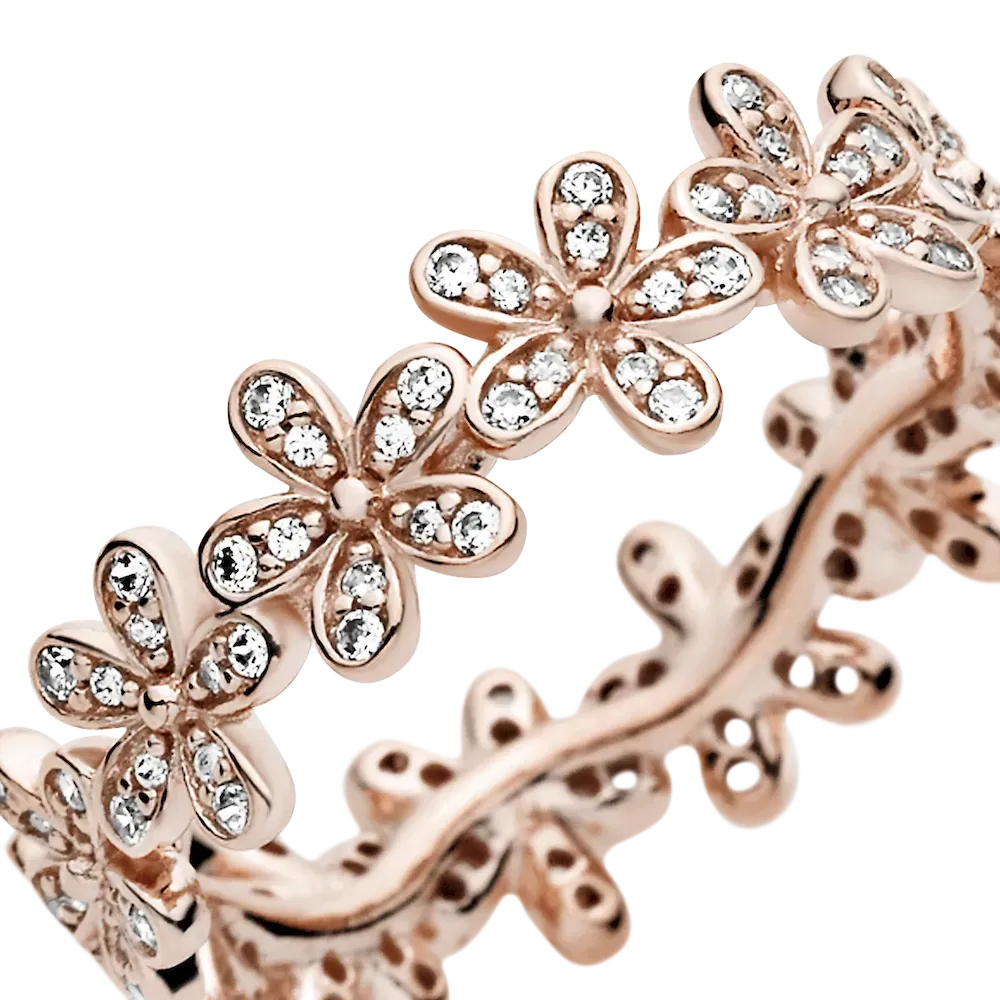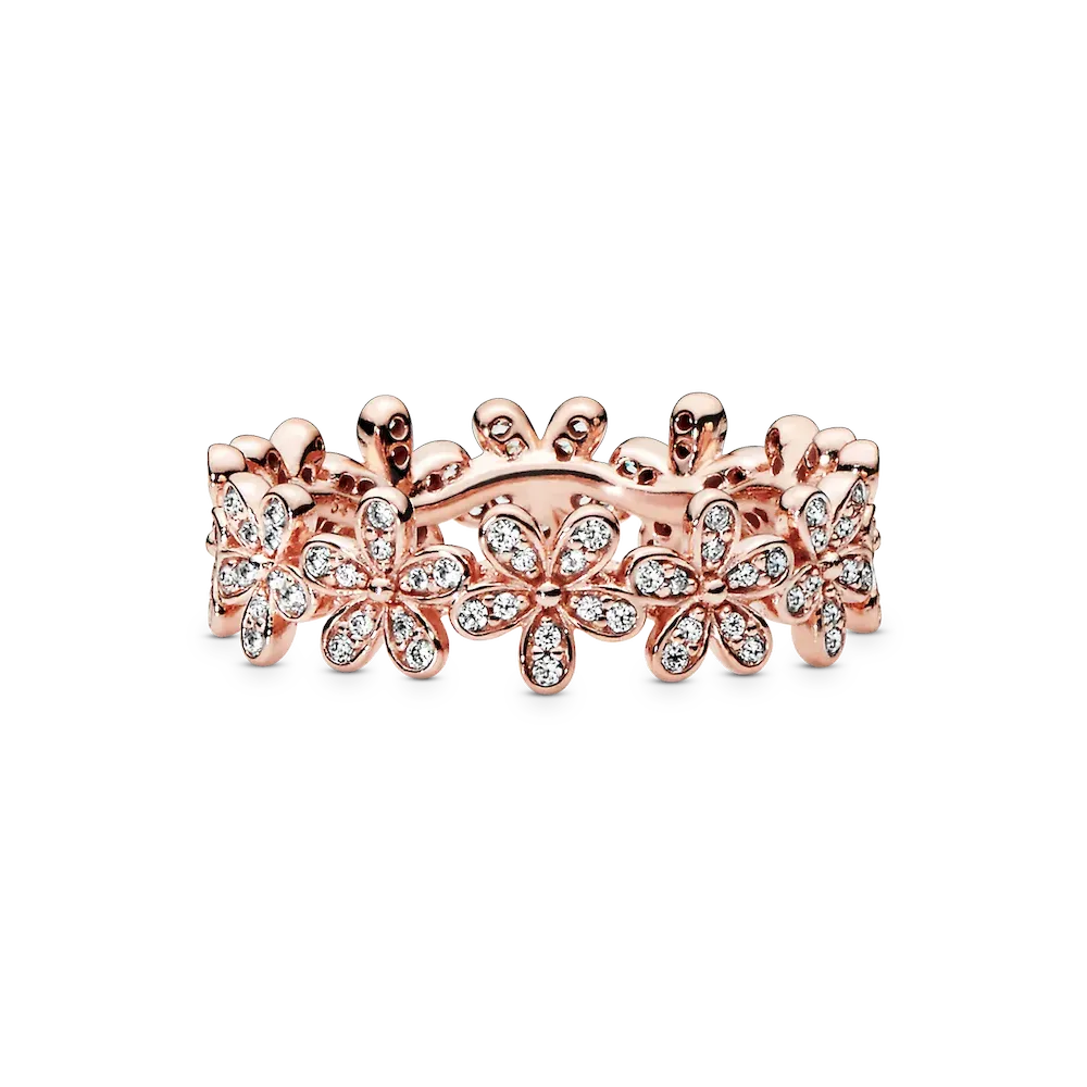 Wrap your finger in flowers with this dazzling Daisy Flower Ring plated with 14k rose gold. Evoking feelings of joy and happiness, the delicate chain of daisies is adorned with shimmering cubic zirconia stones that catch the light. Wear it solo for everyday elegance, or with the Pandora Daisy Earrings and matching necklace for a fabulous floral look.