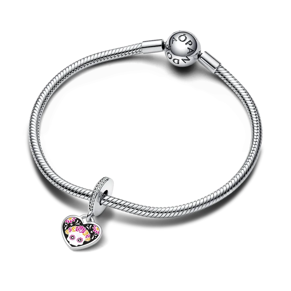 Celebrate the spirit of DÃa de los Muertos with the Day of the Dead Sugar Skull Charm. This heart-shaped dangle charm is beautifully crafted in sterling silver and features a row of sparkling cubic zirconia on the bale, adding a touch of sparkle. The heart itself is engraved with a traditional sugar skull design, complete with a colorful flower crown, and adorned in vibrant shades of black, pink, and orange. A meaningful tribute to the tradition of honoring loved ones, this charm is perfect for bringing joy and remembrance to your collection.