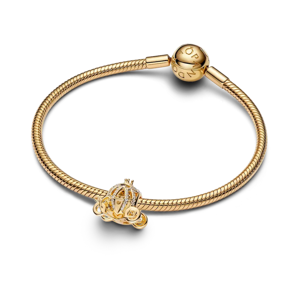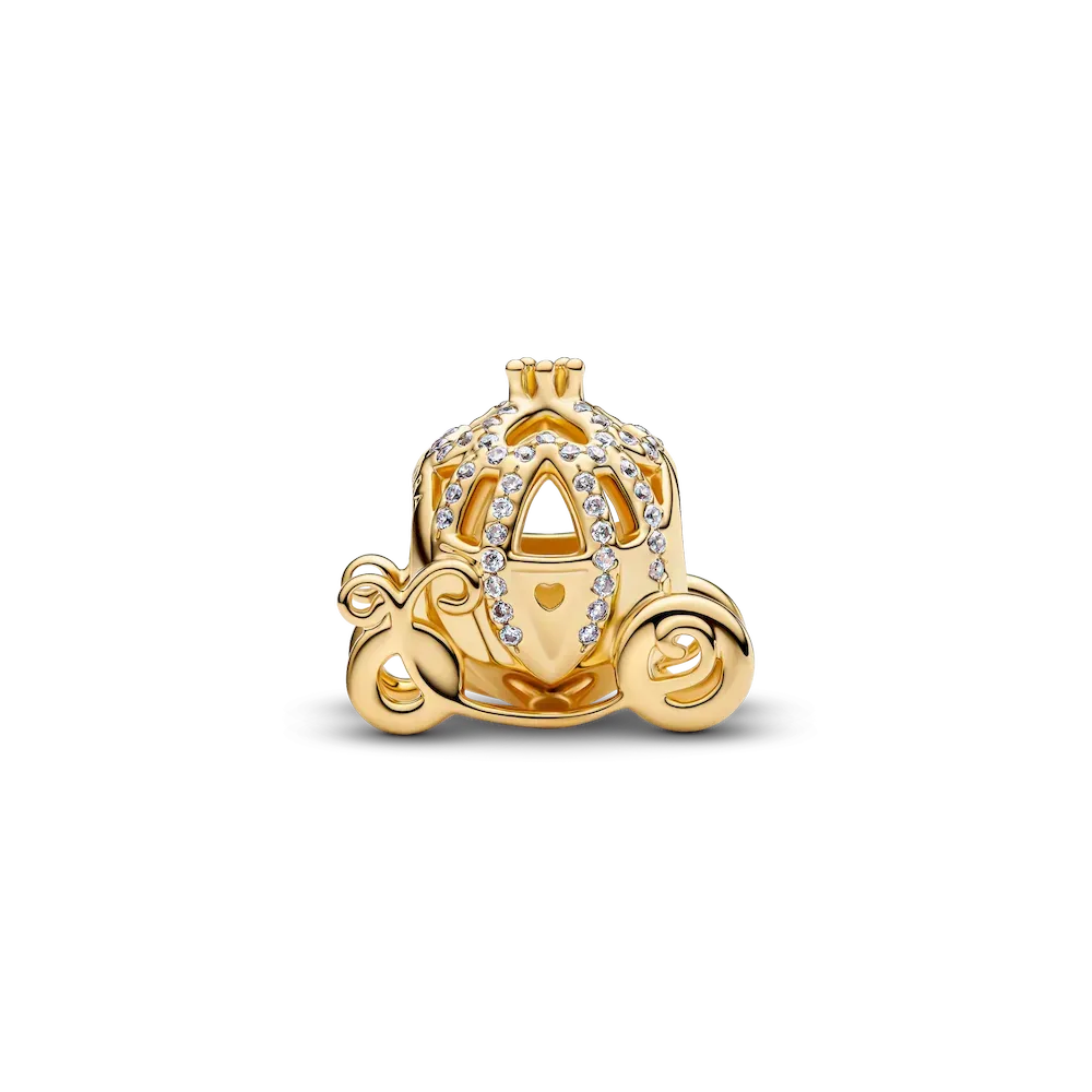 Pay tribute to an iconic story with the Disney Cinderella Sparkling Carriage Charm. A pumpkin carriage is rendered in 14k gold plating in this charm, designed to celebrate Disney’s Cinderella’s 75th anniversary. The openwork pumpkin coach charm features a crown, wheels and an outline of sparkling stones. A must-have for any Disney lover, this charm makes a perfect gift for a loved one or a sweet addition to your own collection.