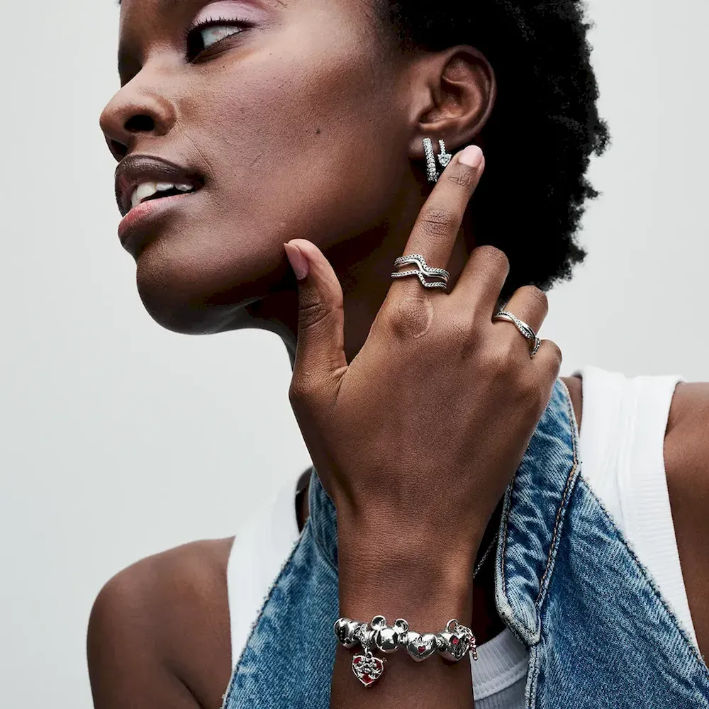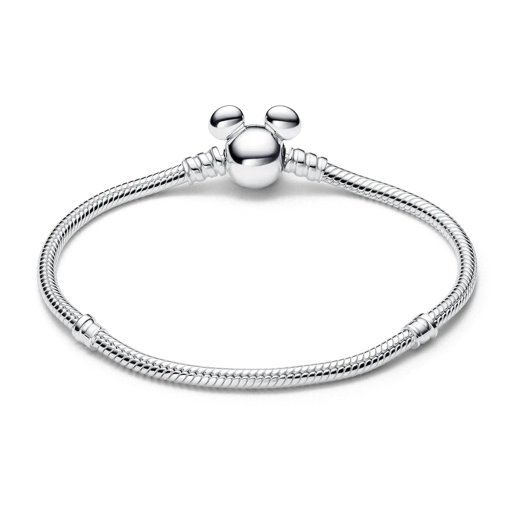 Style your Disney x Pandora charm collection on the Disney Mickey Mouse Clasp Moments Snake Chain Bracelet. This sterling silver snake chain bracelet features a clasp inspired by the iconic Mickey Mouse head silhouette. Press Mickey’s ears in opposite directions to easily open and close the clasp. The bracelet has two threaders (raised charm dividers) and can hold 16-18 charms or dangle charms. The perfect way to showcase your Disney favourites.