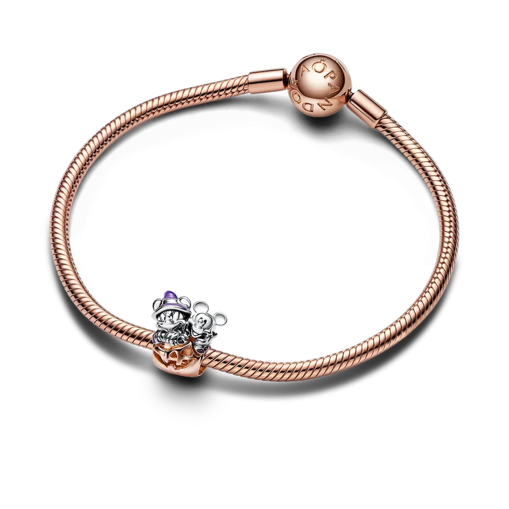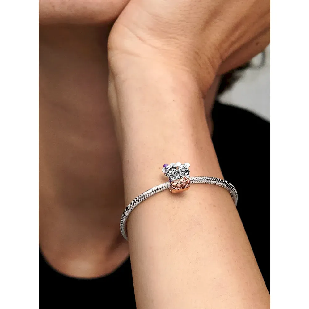 Have a charmed Halloween with the Disney Mickey Mouse & Minnie Mouse Halloween Pumpkin Charm. The 14k rose gold-plated pumpkin design features cut-out and grooved details that create realistic dimension. A sterling silver Mickey and Minnie Mouse pop out of the pumpkin. Mickey wears a Halloween costume with glittering enamel, while Minnie wears a costume with glow-in-the-dark details. A festive addition to any Disney or Halloween lover’s collection, this playful piece will add some spooky fun to your styling.