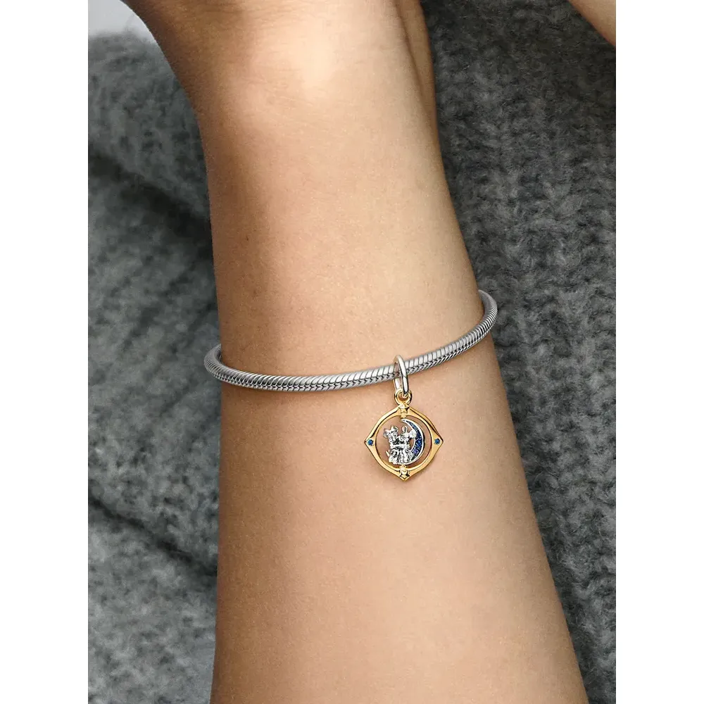 Capture the magic of Disney with the Disney Mickey Mouse & Minnie Mouse Two-tone Spinning Moon Dangle Charm. Mickey Mouse and Minnie Mouse take to the stars in their very own twinkling crescent moon, in this Disney x Pandora charm. The crescent sterling silver moon features Mickey Mouse and Minnie Mouse embracing in a hug, inside a border of 14k gold-plated metal. Making it even more special, everybody’s favourite Disney duo can spin 360°. Wear this two-tone charm with your favorite mixed-metal look for a playful festive touch.