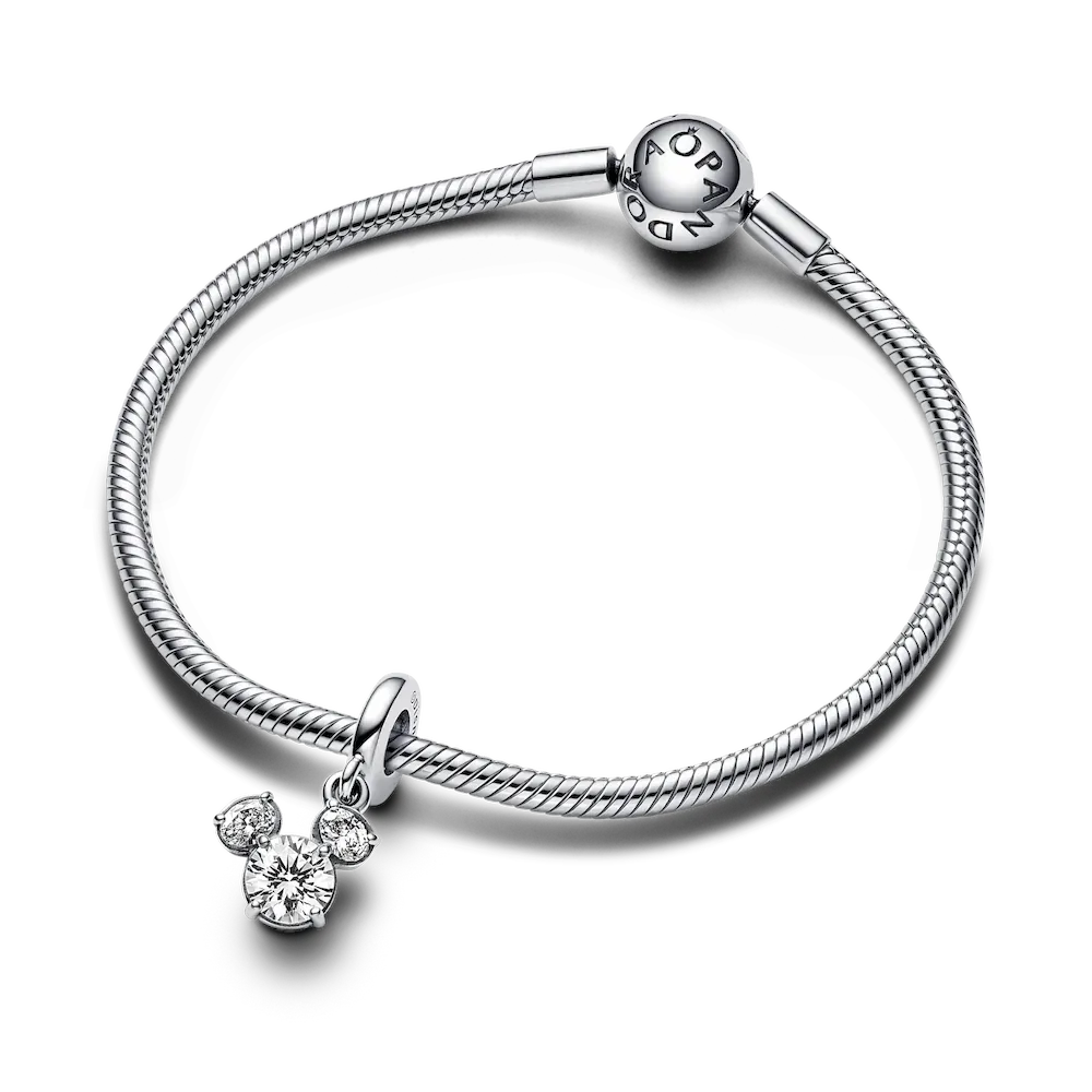 Add a sprinkling of Disney magic with the Disney Mickey Mouse Sparkling Head Silhouette Dangle Charm. Featuring three clear cubic zirconia stones arranged in the silhouette of the iconic character, this sparkling charm is the perfect holiday gift for yourself or someone special. Crafted from sterling silver, it makes a glittering addition to your favorite sterling silver charms. Just like the one that inspired it, a Mickey Mouse charm is a forever classic. Style it with your other beloved charms to bring a touch of magic to any outfit.