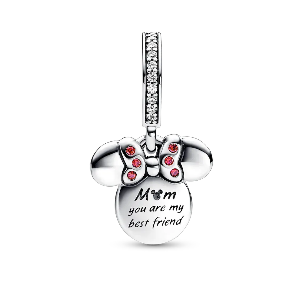 Celebrate a mom who’s your best friend with Disney’s Minnie Mouse. The Disney Minnie Mouse Silhouette Double Dangle Charm features two discs shaped like the iconic Minnie Mouse head silhouette – at the front is an openwork silhouette in 14k rose gold plating set with glittering clear pavé and finished with Minnie’s signature bow with red cubic zirconia stones. Behind it is a sterling silver dangle engraved with the message