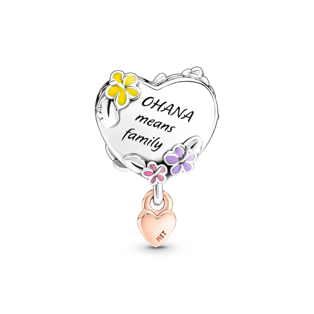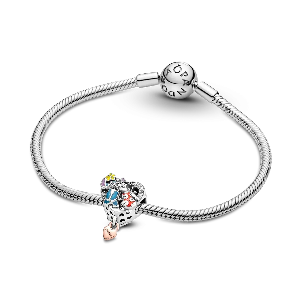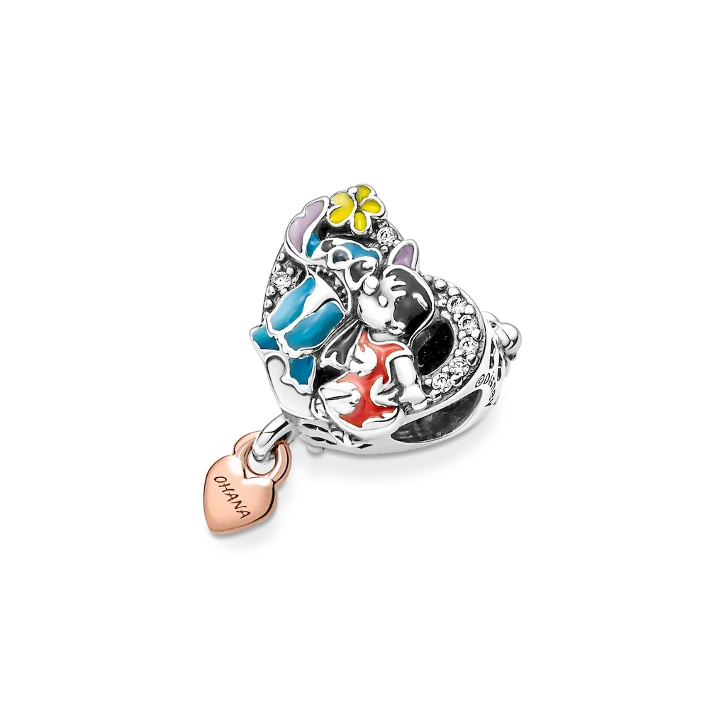 Celebrate the joy of family and friendship with Disney’s Lilo & Stitch. This heart-shaped sterling silver Lilo & Stitch charm features the much-loved characters brought to life with colorful hand-applied enamel, framed by a row of cubic zirconia. The back of the heart features the quote