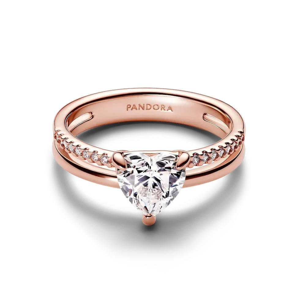 Celebrate love every day with our Double Band Heart Ring. Crafted from 14k rose gold plating, the ring features a heart-shaped clear cubic zirconia, set in the center of a polished band and a pavé band, which is adorned with 18 bead-set cubic zirconia. The bands are held together by the heart, creating a meaningful ring that celebrates the bonds that connect us.