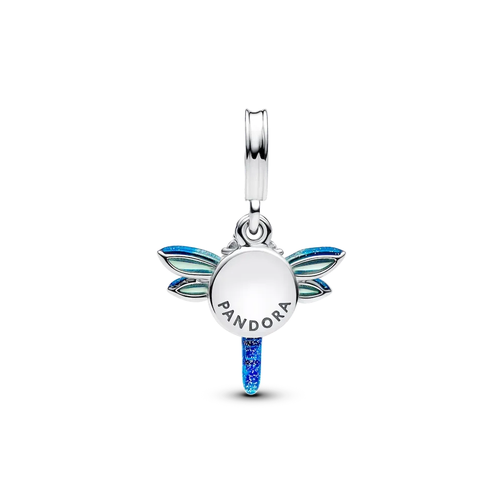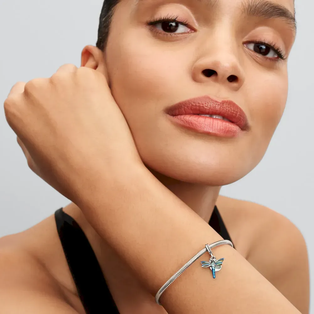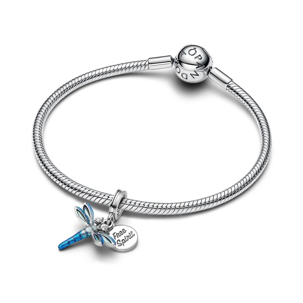 For the free spirits. Inspired by a dragonfly dancing in the wind, this sterling silver dragonfly charm symbolises embracing change and living in the moment. Transparent enamel brings lightness to the dragonfly’s wings, and holographic glitter enamel shimmers on its body. Sparkling stones form the dragonfly’s eyes and a round disc behind it bears the message