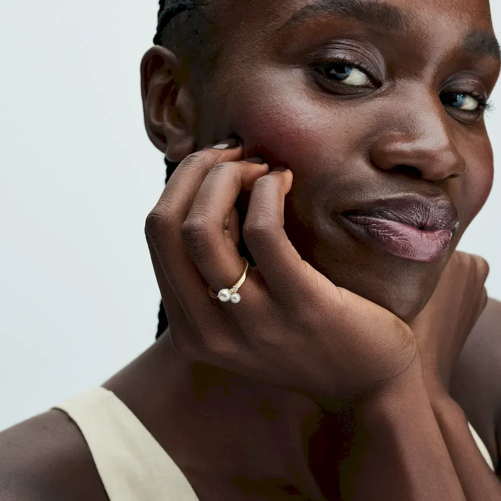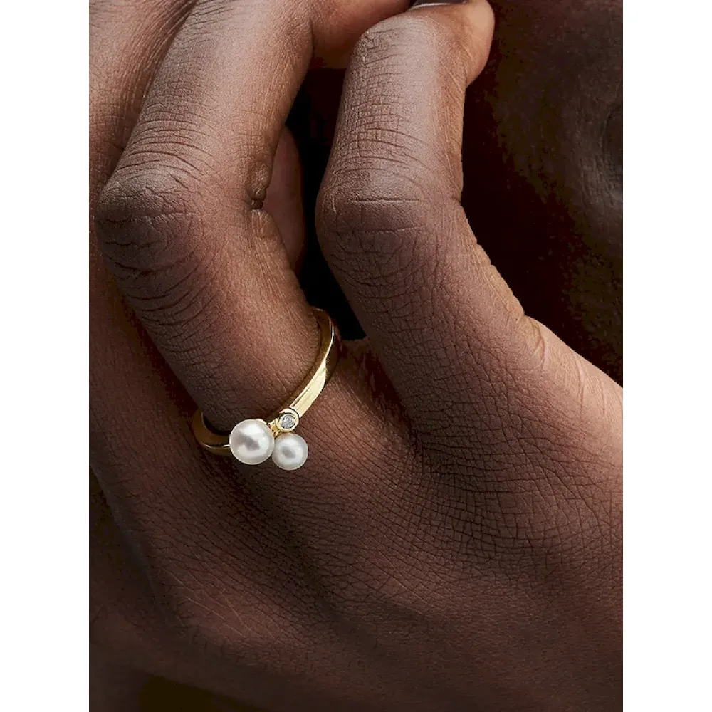Celebrate togetherness our Duo Treated Freshwater Cultured Pearls Ring from the Pandora Timeless collection. Plated with 14k gold, the slightly squared profile of the band showcases two asymmetrically placed treated freshwater cultured pearls, accompanied by clear cubic zirconia. This unique piece, embellished with the engraved Pandora logo, captures the essence of classic pearls, symbolizing beauty, wisdom, and love. Wear it as a symbol of your unique connection. Please note each treated freshwater cultured pearl is unique and can vary in size and color; normal wear and tear may occur with this material. Our freshwater cultured pearls are treated with bleaching and luster enhancement.