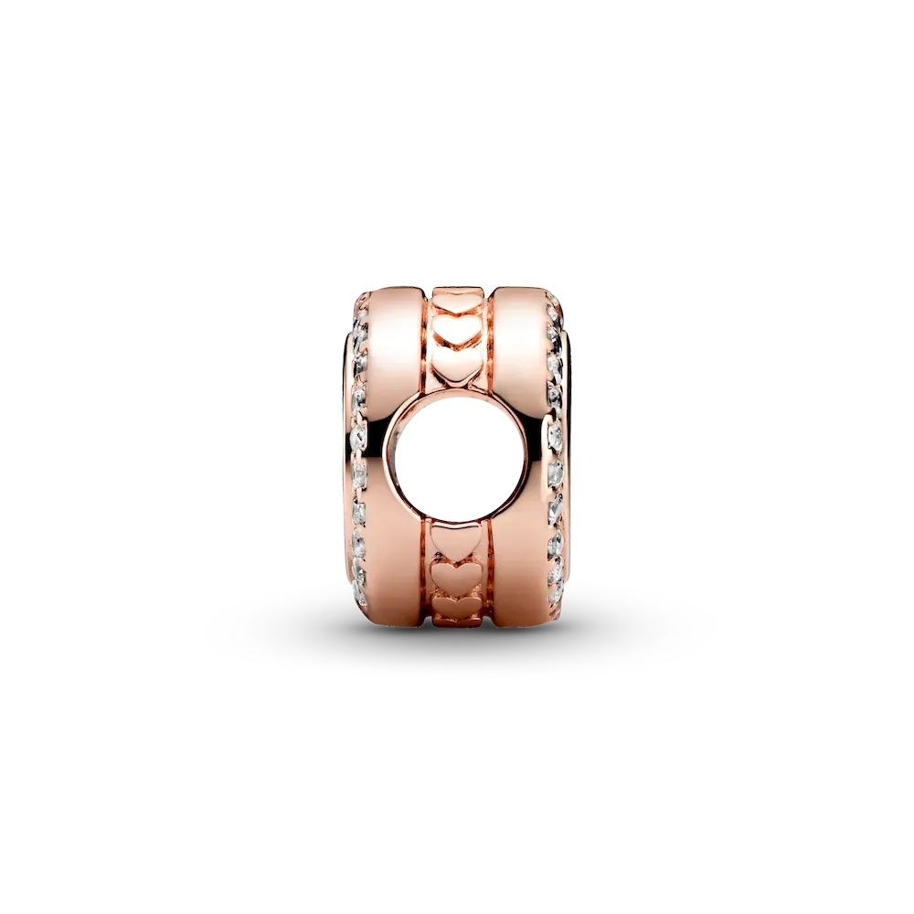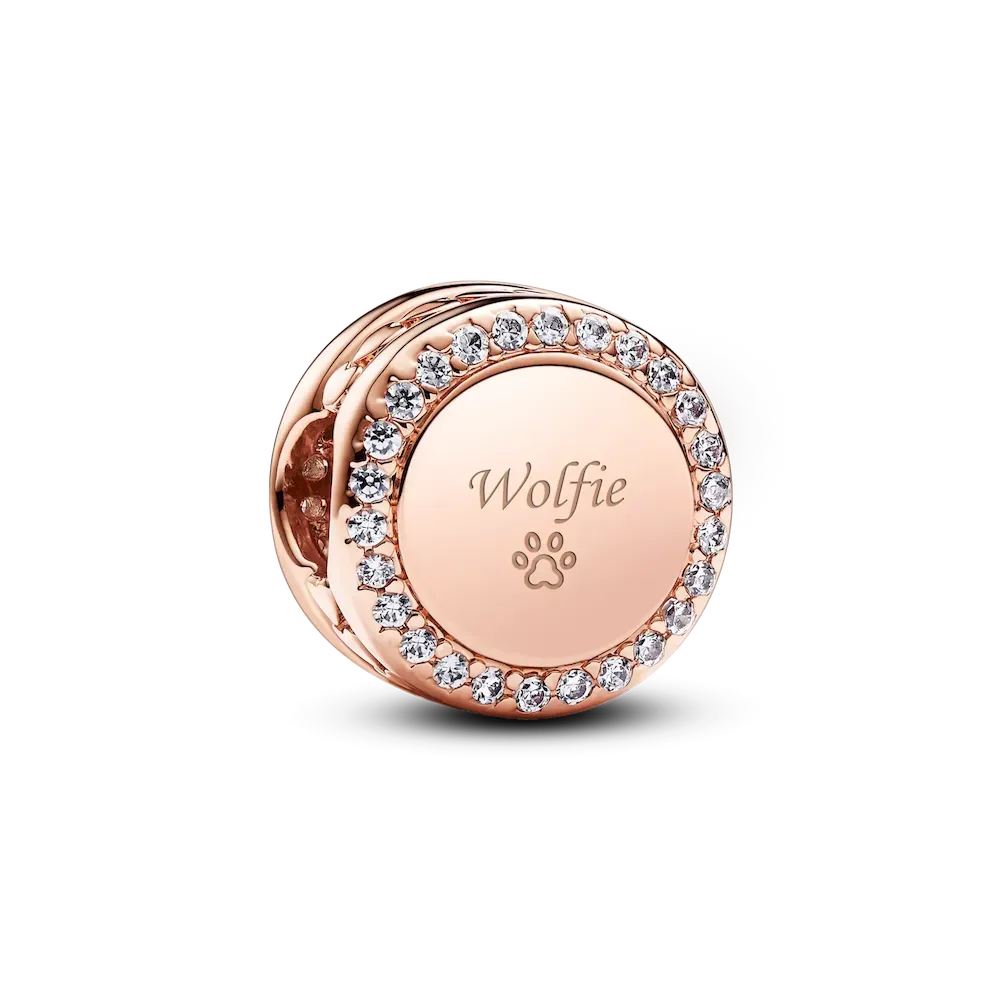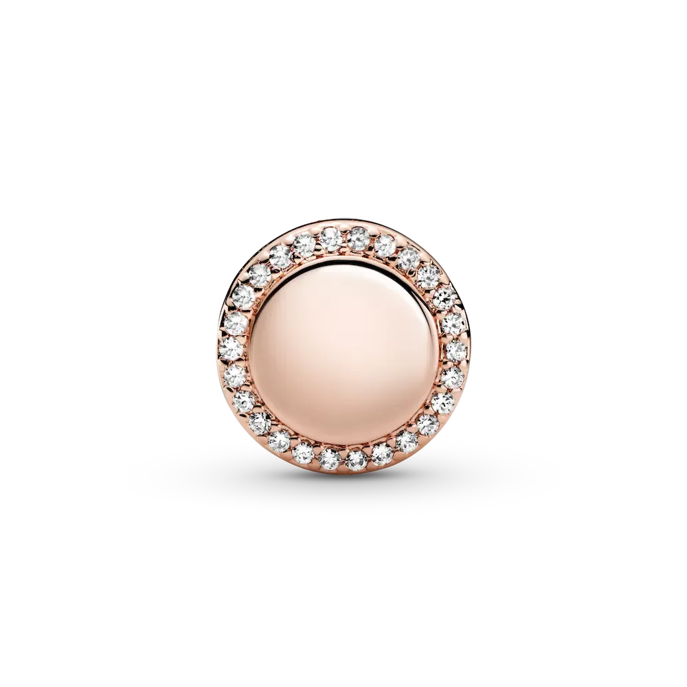 Add this simple-yet-sleek charm to your Pandora collection. This polished Engravable Sparkling Button Charm is hand-finished in 14k rose gold plating, and features 52 bead-set round brilliant-cut clear cubic zirconia stones in a delicate ring. This Pandora piece is all about self-expression: choose to keep it blank and let the symbol speak for itself or engrave the front, the back or both. Pandora Engraving is only available in select stores and markets.