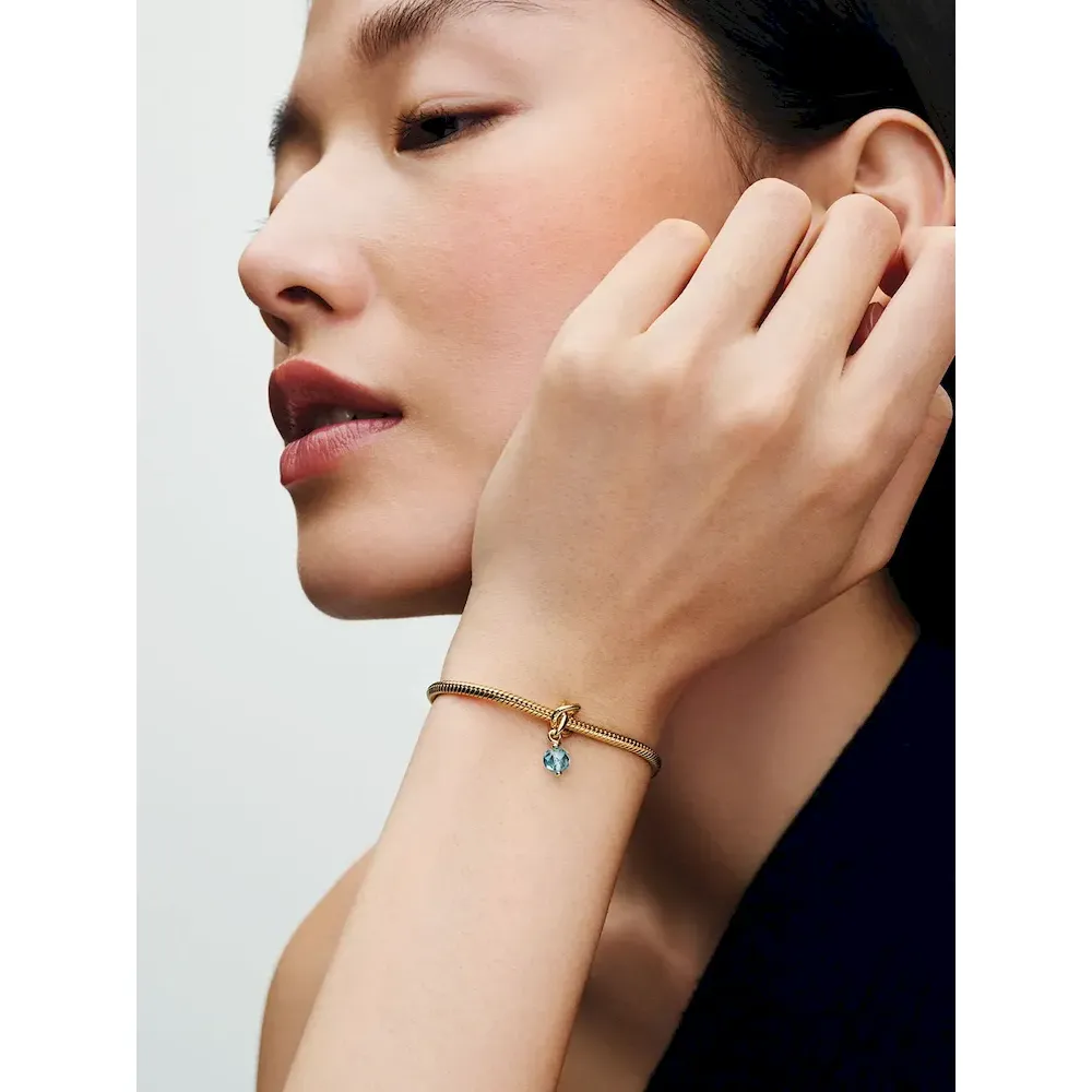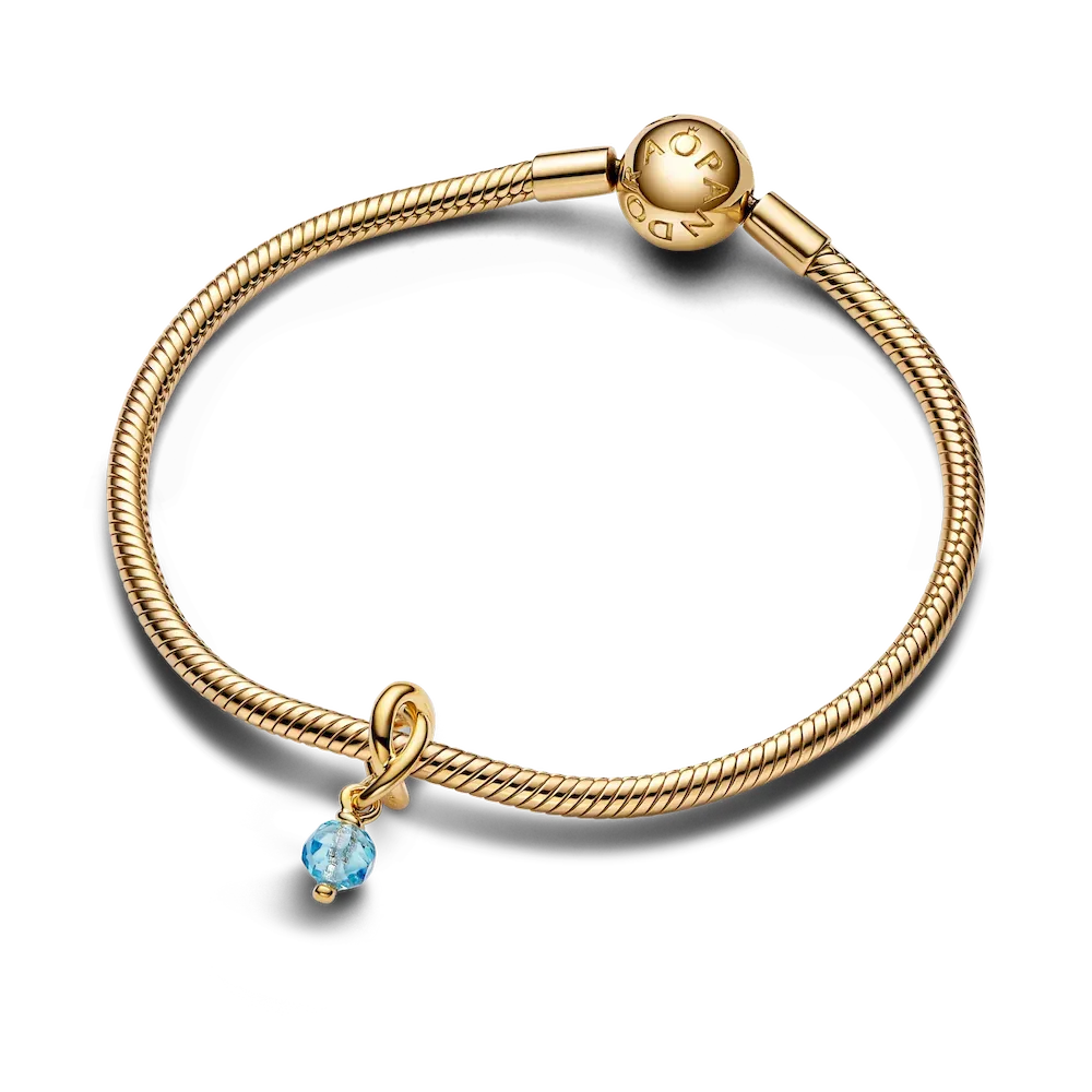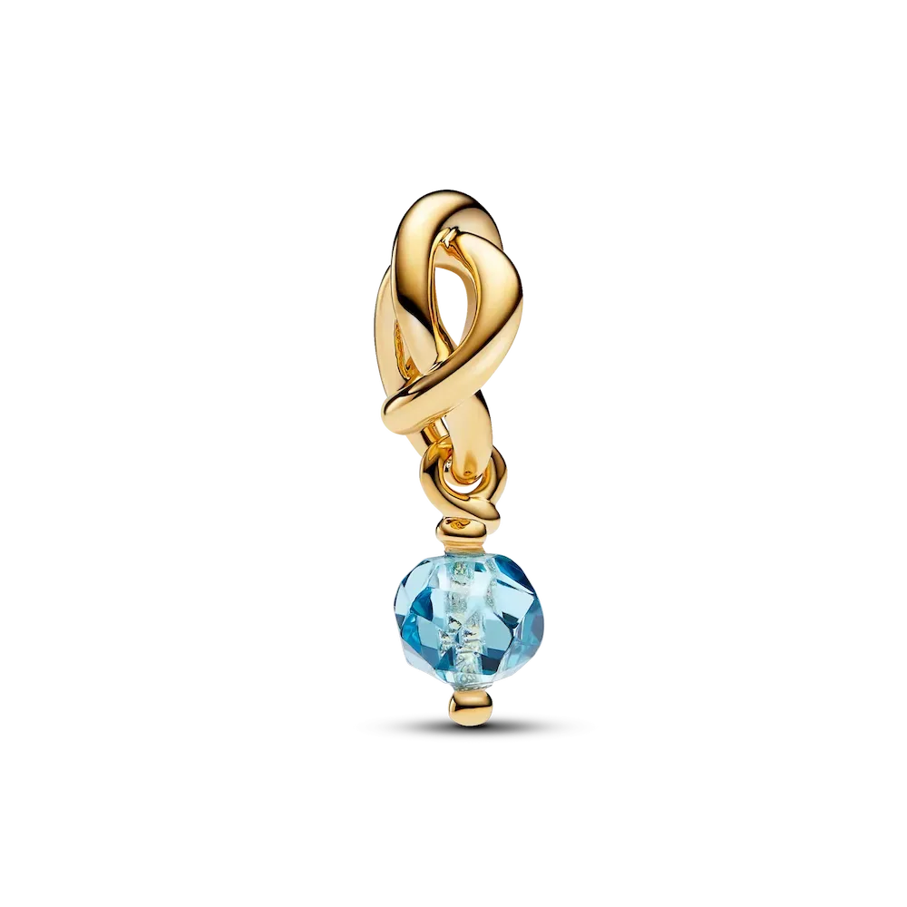 Wear a symbol of forever, that’s personal to you. This 14k gold-plated dangle charm is made up of a triple knotted circle that intertwines to resemble an infinity sign. The twist carries a faceted sea aqua blue man-made crystal, which dangles from the charm. Wear yours to add a drop of color to your carrier, or gift it to the one you want in your life forever.