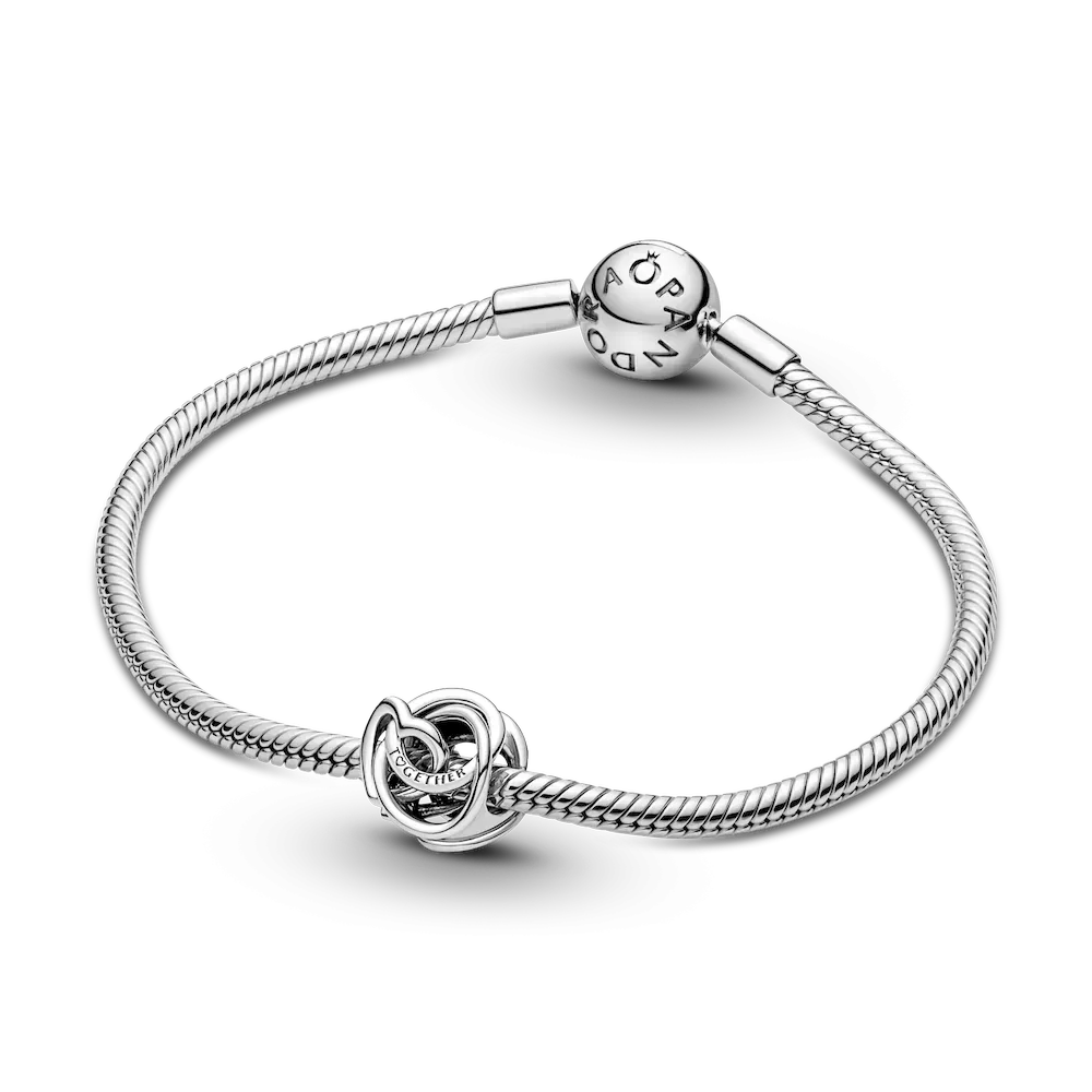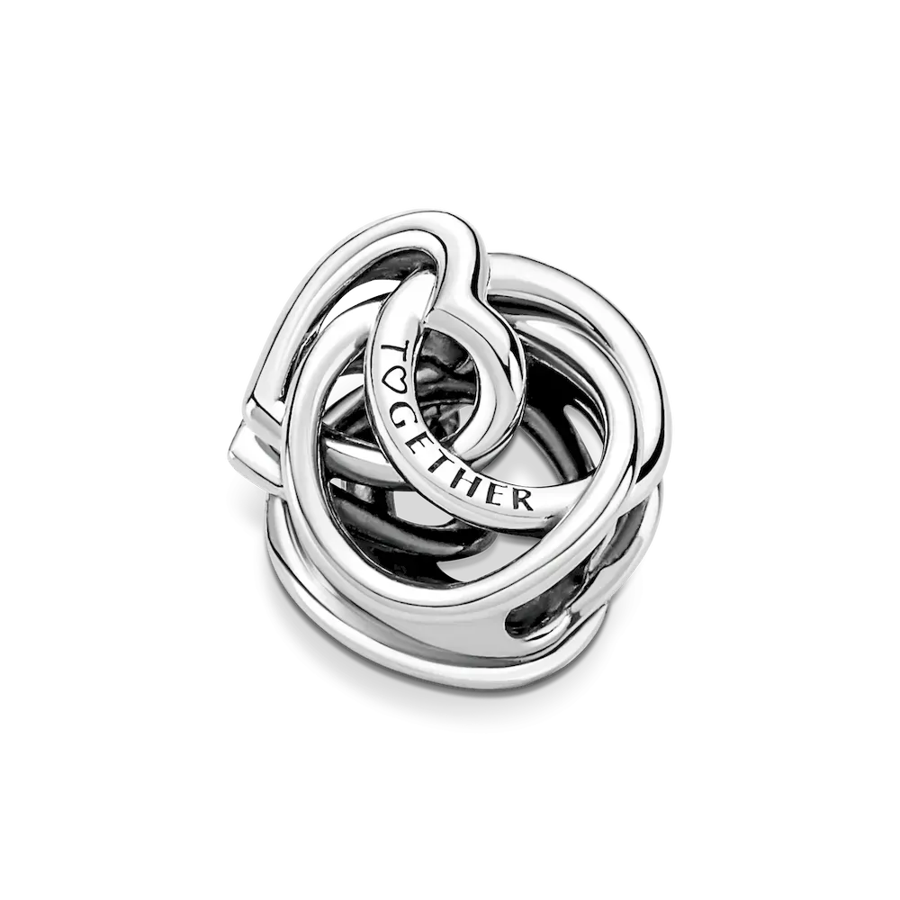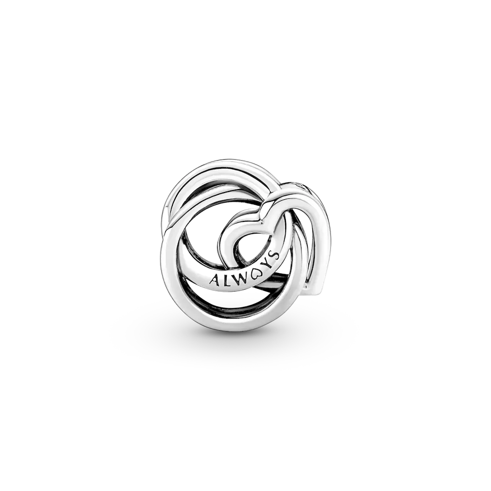 Celebrate unbreakable bonds with the Family Always Encircled Heart Charm. This sterling silver charm features a series of circles entwined with an open heart engraved with the words,