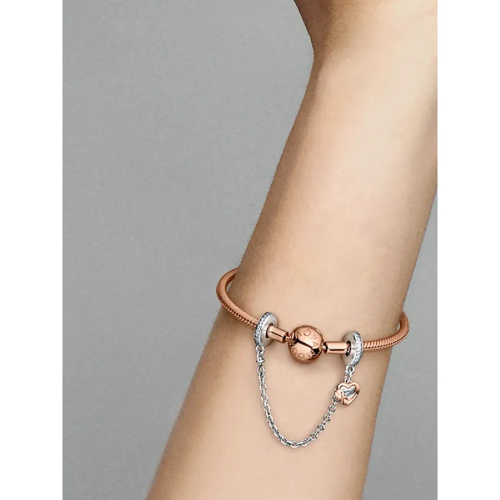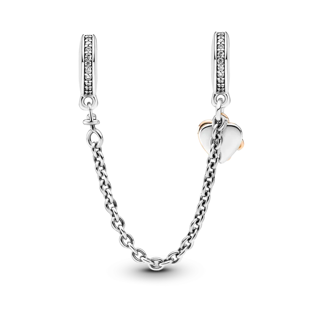 Keep your charms safe and stylish with the Family Heart Safety Chain Charm. This two-tone safety chain charm is hand-finished in sterling silver and 14k rose gold-plated metal. It features two dangling hearts, one warm-toned open heart with an infinity sign and a second heart-shaped sterling silver disc engraved with