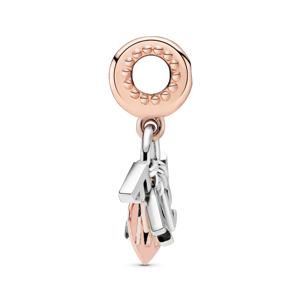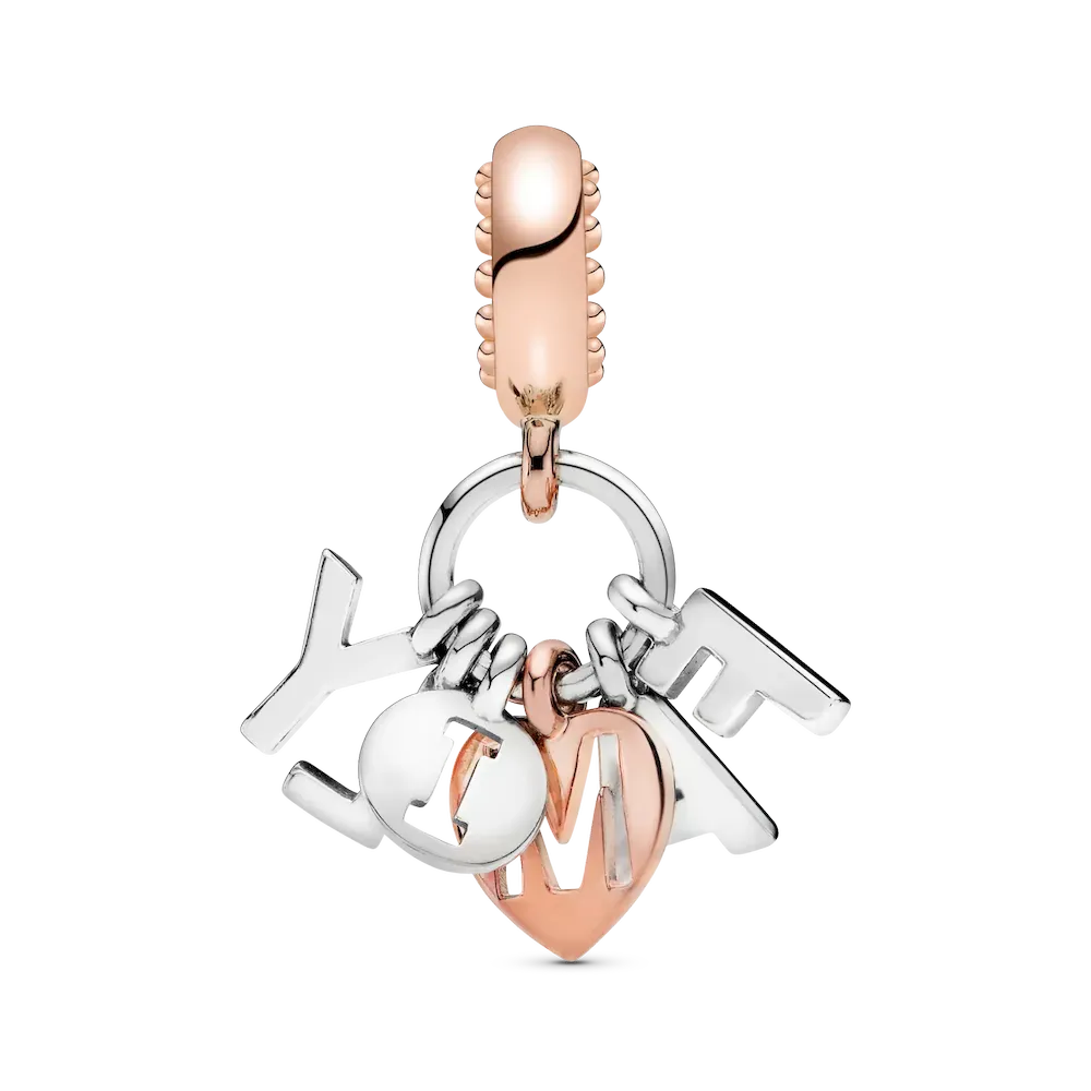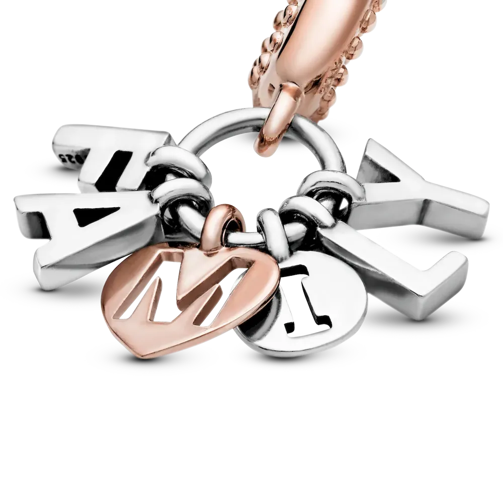 Wear what matters the most to you on your bracelet with this playful Family Letters Dangle Charm in sterling silver and 14k rose gold-plating. Made to be worn on Pandora Moments bracelets, the two-tone design holds six letter charms that spell out the word