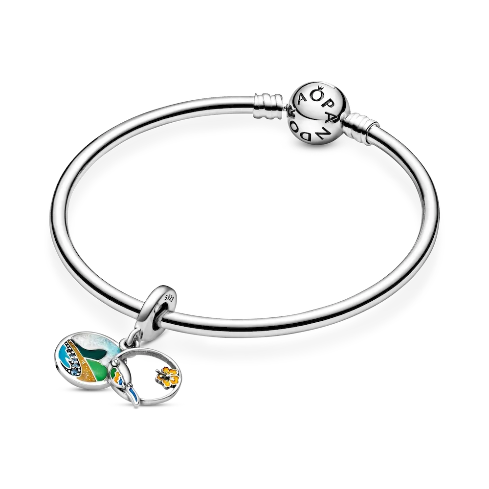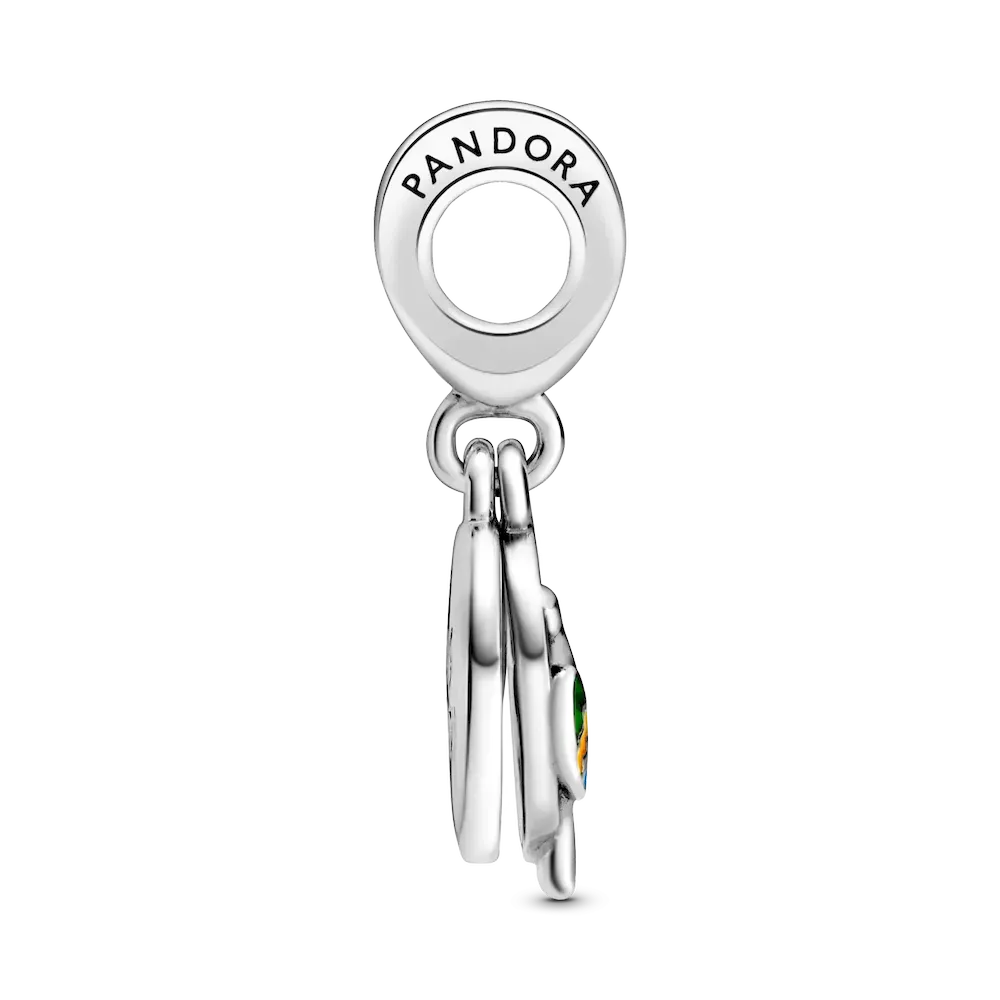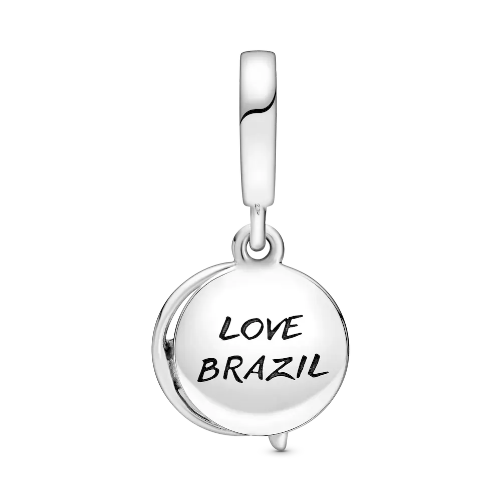 Commemorate the trip of a lifetime or honor your Brazilian heritage with this Brazil Beach & Parrot Dangle Charm. Featuring a double dangle design, one dangle shows a beautiful Brazilian beach scene with sparkling icy blue crystals. The second dangle is open front and depicts a parrot and hibiscus flower with colorful enamel detailing. The rear of the dangle charm is engraved with the words “Love Brazil” to remind you of the special country.