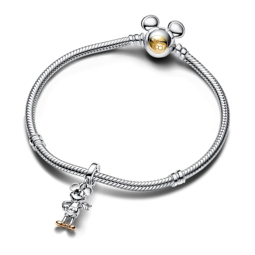 Collect a piece of Disney history with the Disney 100th Anniversary Mickey Mouse Lab-grown Diamond Dangle Charm. This sterling silver charm depicts the iconic Mickey Mouse in lifelike detail, with a lab-grown diamond sparkling from his hand, solid 14k gold shoes and black hand-applied enamel details on his eyes and nose. Collectors will appreciate the engraved Pandora, Disney and Disney100 logos that adorn this charm. A symbol of imagination, optimism and fun, this Mickey Mouse charm is sure to make anyone smile.