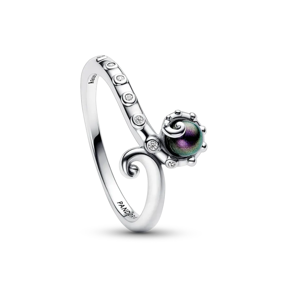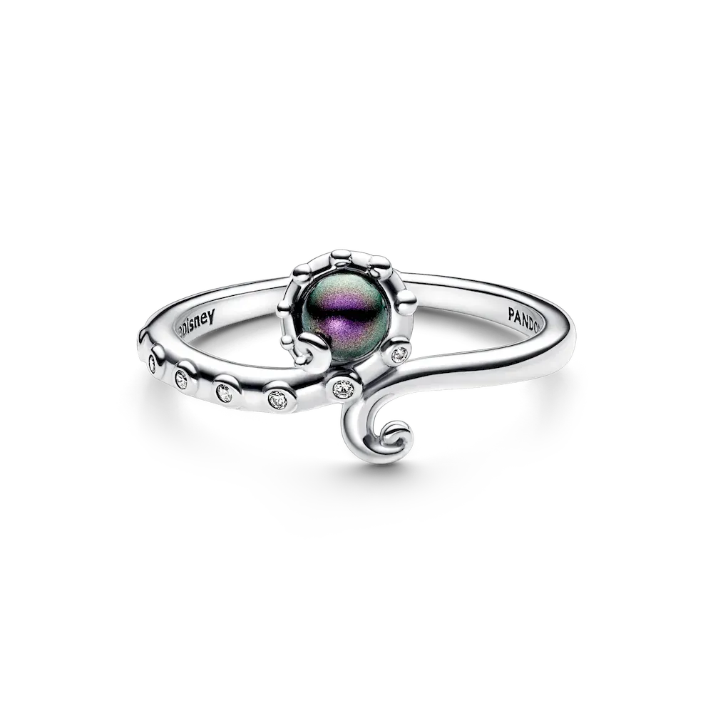 Channel the deepest corners of the ocean with our Disney The Little Mermaid Ursula Ring. Inspired by the mysterious power of Ursula, this ring captivates with a luminous purple lacquered artificial pearl set between two sterling silver tentacles. Sparkling stones and microbeads along one side of the ring band catch the light like the sun reflecting off the waves.