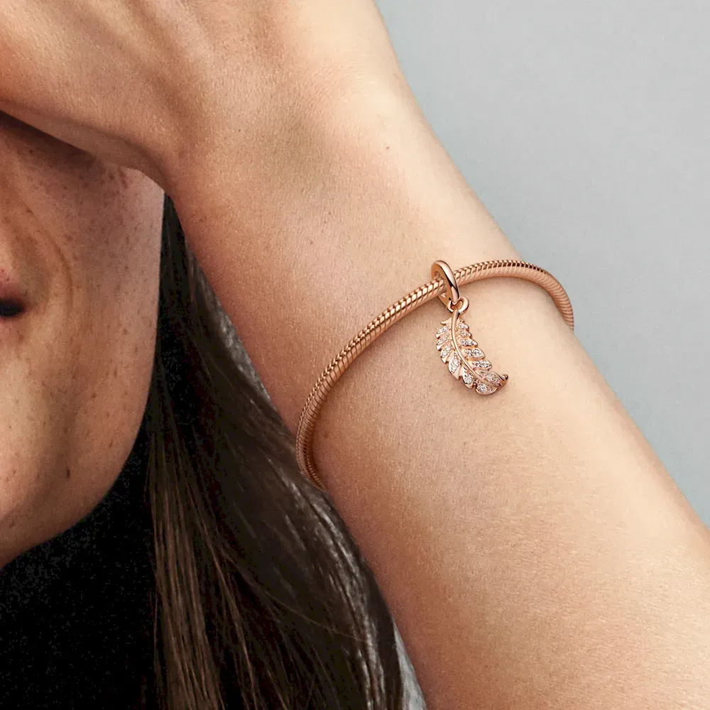 Catch the season’s light with our Floating Curved Feather Dangle Charm. This 14k rose gold-plated dangle charm features a feather curved to look like it is suspended in the air, delicately falling to the ground. The front of the feather is set with round brilliant-cut clear cubic zirconia following its whimsical shape. Style it with other 14k rose gold-plated pieces to enhance your spring glow.