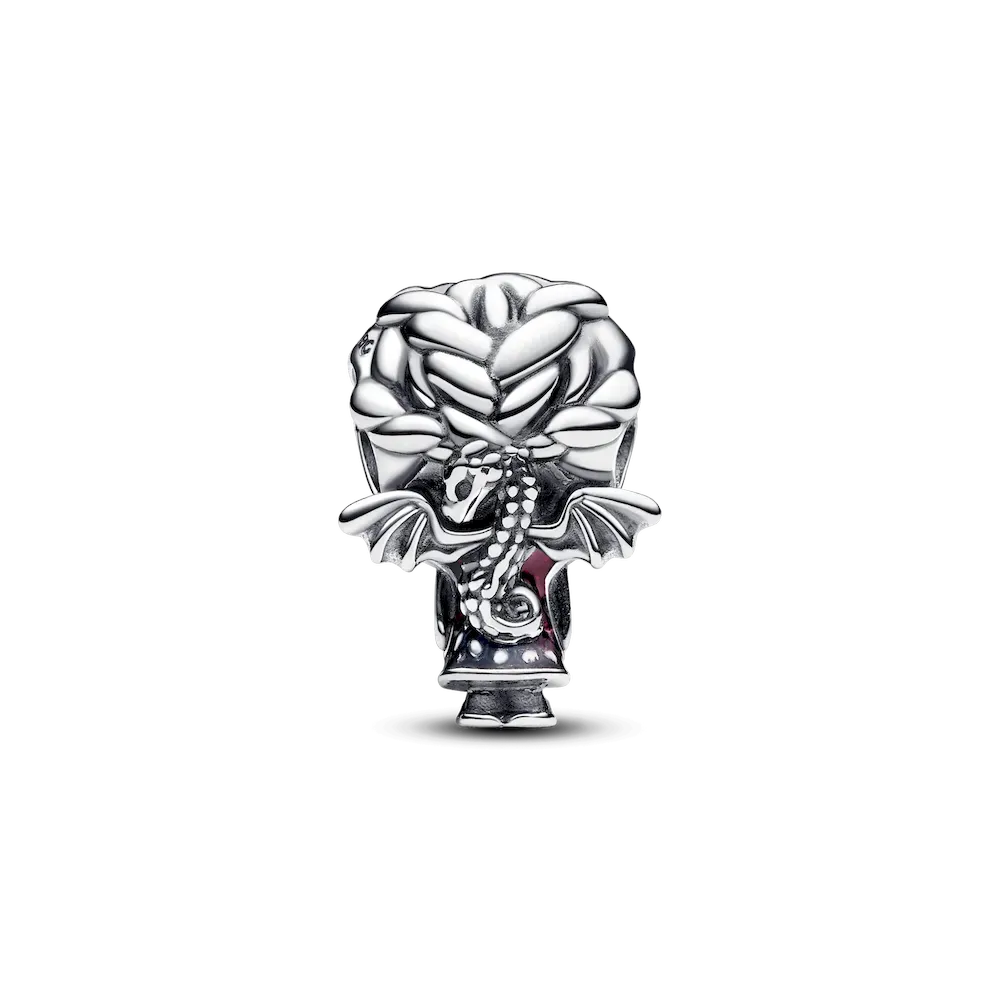 Wear a symbol of fierce courage with the Game of Thrones Daenerys Charm. Shaped like the iconic Daenerys Targaryen character from Game of Thrones, this sterling silver charm features an enlarged head and fine detailing, including transparent red enamel with a dragon-scale pattern on the clothes. On her back sits a small replica of Drogon, one of Daenerys’s three dragons. This charm will remind you of her strength and determination on her incredible journey.