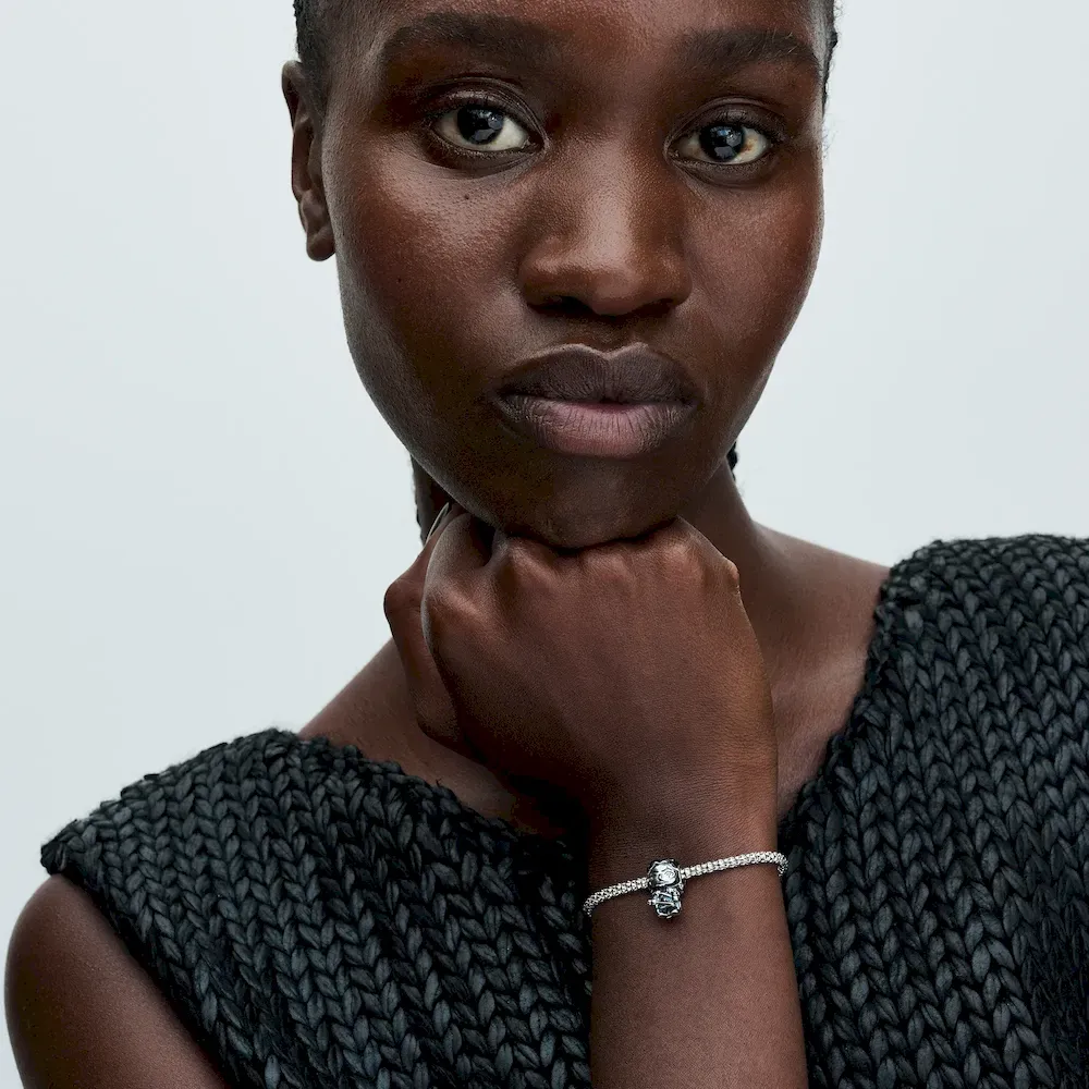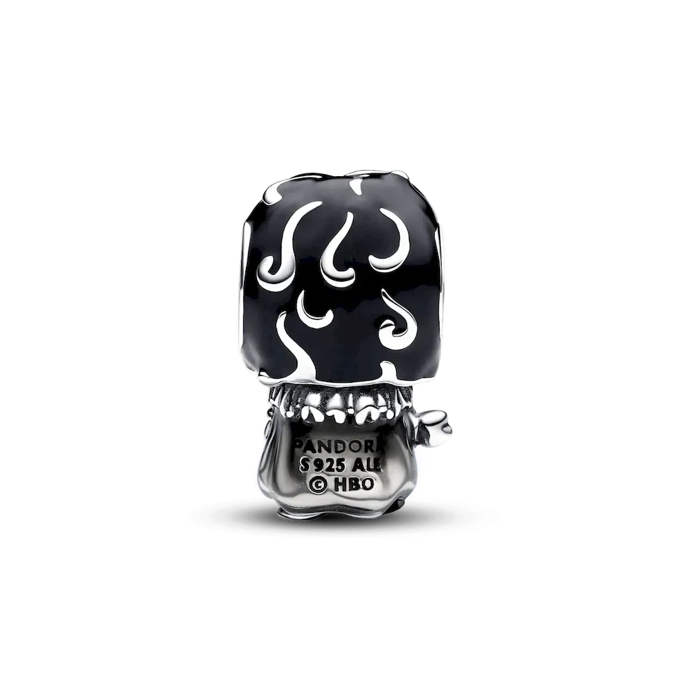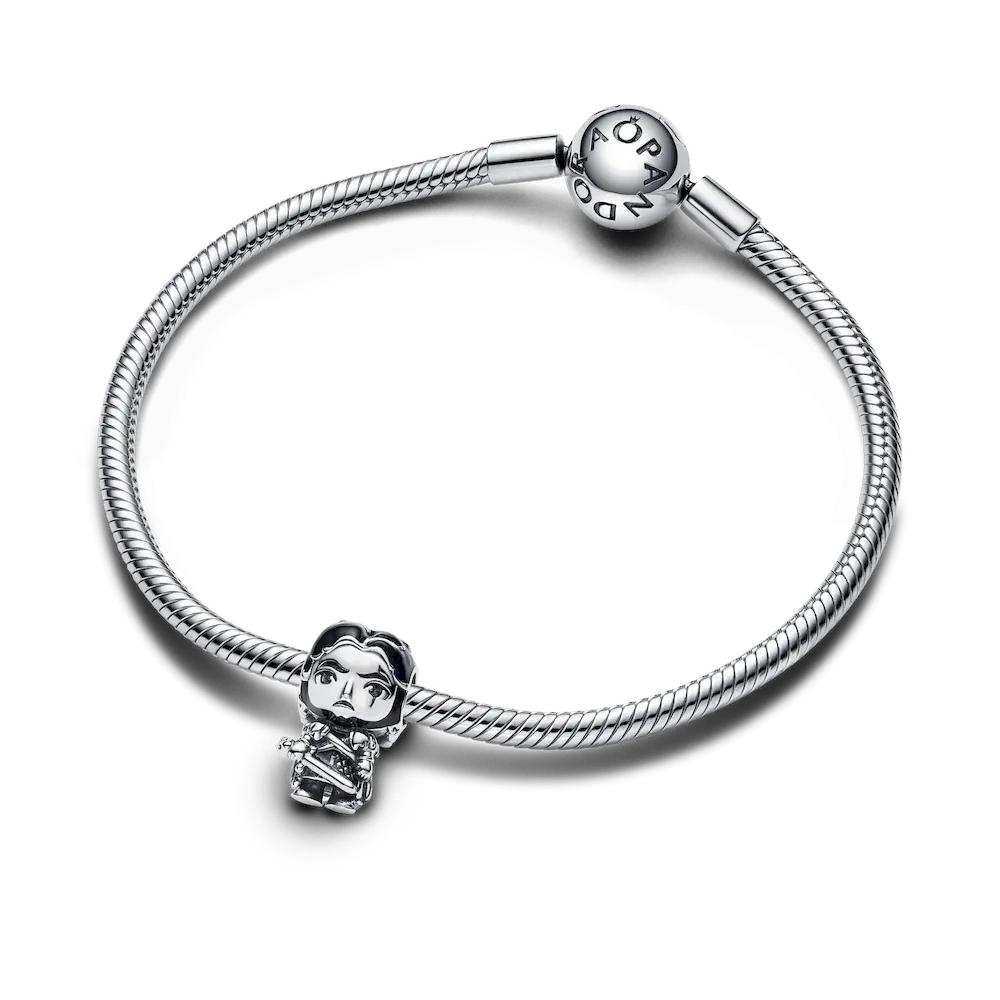Wear your house allegiance with our Game of Thrones Jon Snow Charm. Crafted in sterling silver, the charm depicts Jon Snow with his trademark features including a scar on his left eye, a moustache, dark curly hair and his iconic cape with fur around his neck. The details are highlighted in hand-applied enamel for depth of colour. He is also carrying a sword with the head of a Direwolf, his family’s sigil of loyalty and courage. Wear it as support for the King in the North or gift this Game of Thrones x Pandora charm to someone special.