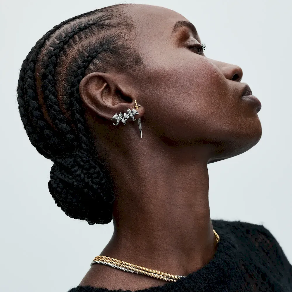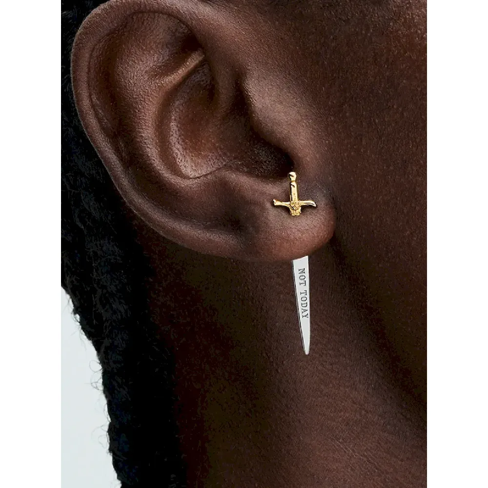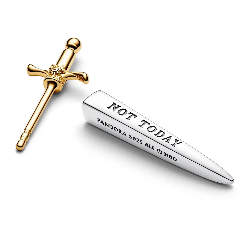 Show your allegiance to House Stark with this Game of Thrones Needle Single Earring. Inspired by the iconic sword that Arya Stark receives from Jon Snow, this earring is crafted in sterling silver and features a 14k gold plated hilt with decorative motifs. The earring hangs at an angle and was designed to be worn with the gold-plated section to face the front to achieve the full effect. Featuring the engraving