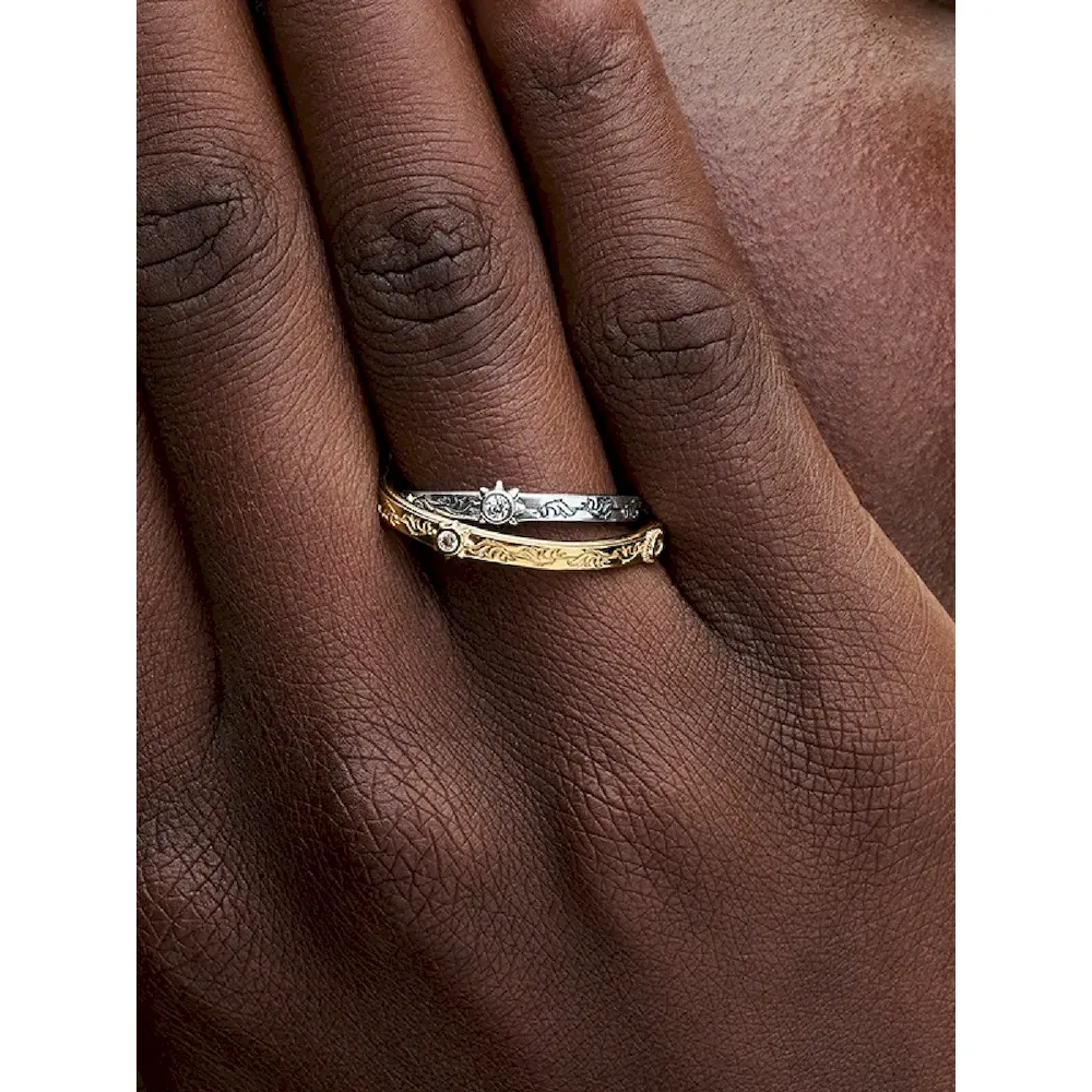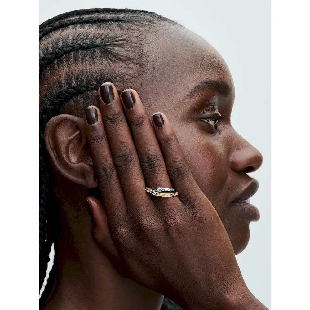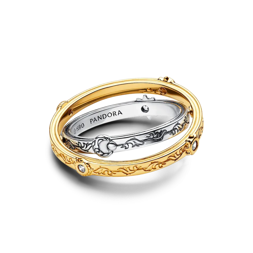 Show your strength with the Game of Thrones Spinning Astrolabe Ring. This spinning ring from the Game of Thrones x Pandora collection is plated with 14k gold and features spinning bands with intricate detailing, reminiscent of a true astrolabe. The two ring bands are connected by pins, allowing for movement. The intricate detailing adds a mythical touch together with the sparkling cubic zirconia. Inspired by the history of Westeros, it’s the perfect piece for the Game of Thrones fan in your life.