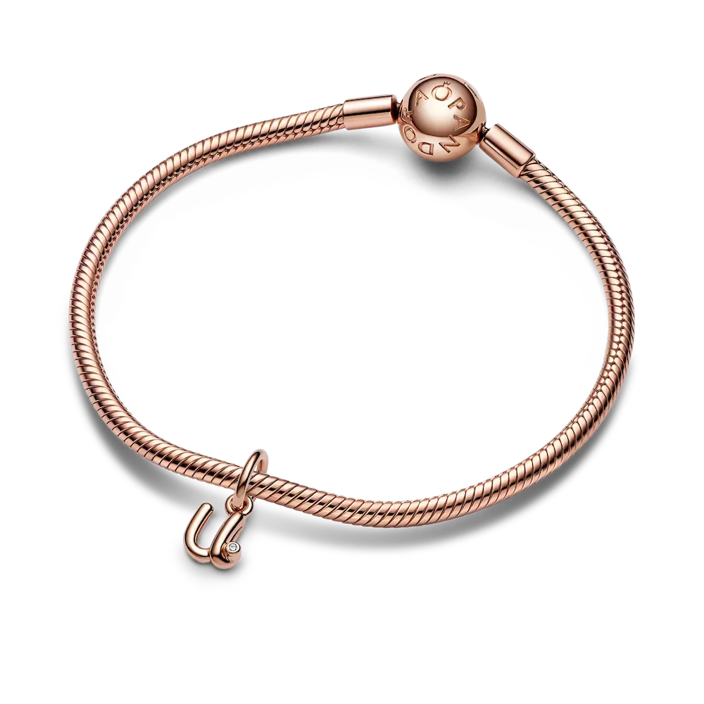 Spell it out with our Letter u Script Alphabet Dangle Charm. Inspired by bent wire and the movement of a pen across paper, this 14k rose gold-plated charm features a three-dimensional letter U that looks handwritten. The end of the lower-case letter is playfully punctuated with a round brilliant-cut clear cubic zirconia, representing that there is something precious in all of us. Wear it as a symbol of who you are or a reminder of someone you love.